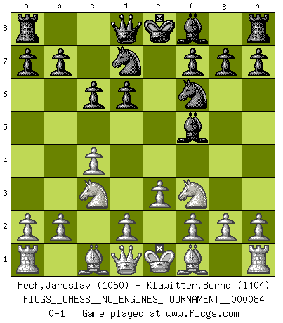 Last move : 0-1 2016 June 19 11:20:3 [Event "FICGS__CHESS__NO_ENGINES_TOURNAMENT__000084"] [Site "FICGS"] [Date "2016.02.21"] [Round "1"] [White "Pech,Jaroslav"] [Black "Klawitter,Bernd"] [Result "0-1"] [WhiteElo "1060"] [BlackElo "1404"] 1.c4 e5 2.Nc3 Nf6 3.Nf3 c6 4.Nxe5 d6 5.Nf3 Bf5 6.e3 Nbd7 0-1 This chess game has been lost on time (started : 2016.02.21 22:57:44) English Opening Player Black won this chess game. Follow this game move after move (download)There are two types of sacrifices: correct ones and mine. (Mikhail Tal) Im Reiche der Wirklichkeit ist man nie so glücklich wie im Reiche der Gedanken. (Arthur Schopenhauer) ¿Se han dado cuenta de que Fischer casi nunca ha tenido piezas malas? El las intercambia y las piezas malas se quedan con sus oponenets. (Yuri Balashov) Je menace de comprendre la position. (Anonyme) Nothing is more important for teaching us to understand the concepts we have than constructing fictitious ones. (Ludwig Wittgenstein)