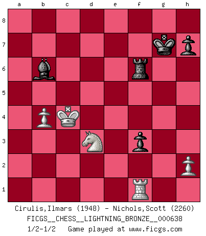 Last move : 1/2-1/2 2016 February 22 15:23:10 [Event "FICGS__CHESS__LIGHTNING_BRONZE__000638"] [Site "FICGS"] [Date "2016.02.22"] [Round "1"] [White "Cirulis,Ilmars"] [Black "Nichols,Scott"] [Result "1/2-1/2"] [WhiteElo "1948"] [BlackElo "2260"] 1.b4 Nf6 2.a3 g6 3.Bb2 Bg7 4.Nf3 O-O 5.c4 d6 6.e3 e5 7.d4 exd4 8.Nxd4 Ng4 9.Ra2 c5 10.Nf3 Ne5 11.Be2 Nbc6 12.Nxe5 dxe5 13.Bc3 Qxd1+ 14.Kxd1 Be6 15.Nd2 Rfd8 16.Kc1 cxb4 17.axb4 b5 18.Ra6 Rac8 19.Ne4 Bf5 20.Nc5 bxc4 21.e4 Nd4 22.Bxd4 exd4 23.exf5 d3 24.Bxd3 cxd3 25.Kd2 Rc7 26.f6 Bh6+ 27.Kc3 d2 28.Rd1 Rb8 29.g3 Rb6 30.Ra2 Rxf6 31.f4 g5 32.R1xd2 gxf4 33.gxf4 Bxf4 34.Rd7 Rxd7 35.Nxd7 Rc6+ 36.Kb3 Be3 37.Re2 Bg1 38.Rg2+ Rg6 39.Re2 f6 40.Ra2 f5 41.Kc4 Rd6 42.Nc5 f4 43.Rxa7 f3 44.Ra8+ Kg7 45.Ra1 Be3 46.Nd3 Bb6 47.Rf1 Rf6 1/2-1/2 Polish (Sokolsky) opening Kingside Castling by player Black (move 4) 10 pieces endgame at move 43 : White KRNPP , Black KRBPP WHITE : King + 1 Rook 1 Knight 2 Pawns BLACK : King + 1 Rook 1 Bishop 2 Pawns This chess game ended in a draw. Follow this game move after move (download)All I want to do, ever, is just play Chess. (Bobby Fischer) Kritik überlasse ich den Spießern. Ich zeige nichts, wofür ich mich schämen muss. (Alexandra Kosteniuk) El Ajedrez es un regaderazo frío para la mente. (Sir John Simon) On a dit que l'homme se distingue de l'animal par le fait qu'il achète plus de livres qu'il ne peut en lire. Je voudrais suggérer qu'inclure à la liste des livres quelques livres d'échecs rendrait la distinction manifeste. (Edward Lasker) Indecision is the key to flexibility. (Unknown)