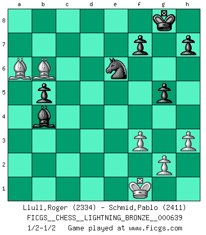Last move : 1/2-1/2 2016 February 23 0:12:40 [Event "FICGS__CHESS__LIGHTNING_BRONZE__000639"] [Site "FICGS"] [Date "2016.02.22"] [Round "1"] [White "Llull,Roger"] [Black "Schmid,Pablo"] [Result "1/2-1/2"] [WhiteElo "2334"] [BlackElo "2411"] 1.e4 e5 2.Nf3 Nc6 3.Bb5 a6 4.Ba4 Nf6 5.O-O Be7 6.Re1 b5 7.Bb3 d6 8.c3 O-O 9.h3 Na5 10.Bc2 c5 11.d4 Nd7 12.b3 exd4 13.cxd4 Nc6 14.Bb2 cxd4 15.Nxd4 Nxd4 16.Bxd4 Bf6 17.Qd3 Nc5 18.Qc3 Bg5 19.Nd2 Ne6 20.Nf3 Bf4 21.Be3 Bb7 22.b4 Rc8 23.Qb2 Qc7 24.Bb3 Qc3 25.Qxc3 Rxc3 26.Bb6 Rd3 27.Rad1 Rxd1 28.Rxd1 Bxe4 29.Nd4 d5 30.Nc6 Kh8 31.f3 Bc2 32.Bxc2 Rc8 33.Bb3 Rxc6 34.Bxd5 Rd6 35.Bf2 g5 36.Kf1 Kg8 37.Rd3 Nc7 38.Be4 Rxd3 39.Bxd3 Bd2 40.Bc5 Nd5 41.a3 Bc1 42.Be4 Nc7 43.Bb6 Ne6 44.Bb7 Bxa3 45.Bxa6 Bxb4 1/2-1/2 Ruy Lopez : Closed Kingside Castling by player White (move 5) Kingside Castling by player Black (move 8) This chess game ended in a draw. Follow this game move after move (download)It is always better to sacrifice your opponent's men. (Savielly Tartakower) Mein Gehirn das ist mein zweitwichtigstes Organ [Aus dem Film: Der Schläfer]. (Woody Allen) Cada Peón es potencialmente una Reina. (James Mason) Aux échecs, l'amour-propre est satisfait quand on remporte la victoire, mais il n'y a pas de honte à être battu. (Benjamin Franklin) Warrior pose battles inner weakness and wins focus. You see that there is no war within you. You're on your own side, and you are your own strength. (Terri Guillemets)