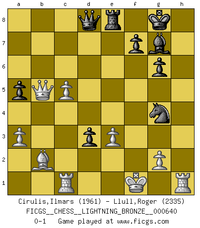 Last move : 0-1 2016 February 23 1:21:25 [Event "FICGS__CHESS__LIGHTNING_BRONZE__000640"] [Site "FICGS"] [Date "2016.02.23"] [Round "1"] [White "Cirulis,Ilmars"] [Black "Llull,Roger"] [Result "0-1"] [WhiteElo "1961"] [BlackElo "2335"] 1.b4 g6 2.Bb2 Nf6 3.a3 d6 4.h4 Bg7 5.e3 O-O 6.Be2 a5 7.c4 e5 8.Nc3 Na6 9.h5 Nxh5 10.b5 Nc5 11.d4 exd4 12.exd4 Nd7 13.Bxh5 gxh5 14.Qxh5 Nf6 15.Qf3 Bg4 16.Qd3 Bh5 17.Nge2 c6 18.Kf1 Bg6 19.Qh3 Re8 20.Nf4 Rc8 21.Rc1 d5 22.c5 b6 23.Na4 bxc5 24.dxc5 cxb5 25.Nb6 Rc7 26.Qb3 d4 27.Qxb5 Rce7 28.Nc4 d3 29.Nxg6 hxg6 30.Ne3 Rxe3 31.fxe3 Ng4 0-1 Polish (Sokolsky) opening Kingside Castling by player Black (move 5) Player Black won this chess game. Follow this game move after move (download)Chess is played with the mind and not with the hands ! (Renaud and Kahn) Das Schachspiel ist ein See, in welchem eine Mücke baden und ein Elefant ertrinken kann. (Emanuel Lasker) Fischer era un maestro de claridad y un Rey del posicionamiento astuto. Sus oponentes podían ver hacia donde se dirigía pero eran impotentes para detenerlo. (Bruce Pandolfini) Il n'y a pas eu de défaite parce que je ne crois pas que cet ordinateur ait jamais existé. IBM a triché en refusant d'imprimer les modes de recherche de la machine. C'est évident, pendant le match, des coups décisifs ont été joués par des êtres humains. Aujourd'hui, les meilleurs spécialistes en informatique ne peuvent toujours pas expliquer comment Deep-Blue a pu jouer contre la logique des ordinateurs. IBM a gagné une guerre de communication, mais ils sont incapables de prouver que l'ordinateur a gagné tout seul. (Garry Kasparov) Bobby never cared about money, though. His only desire was to prove that his choices were correct: He wanted chess to be important because he was a chess player, and he wanted to be important. Bobby knew money was important, but he didn't have a clue why, outside of clothes and status. The only way he could accomplish what he wanted was to fight for a lot of money. Once he got it, he gave it away. He did not know how to spend it. And once he'd become champion, after, essentially, sacrificing his life for it, he didn't know how to spend his time. (Bob Wade)