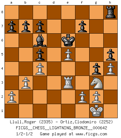 Last move : 1/2-1/2 2016 February 23 21:5:35 [Event "FICGS__CHESS__LIGHTNING_BRONZE__000642"] [Site "FICGS"] [Date "2016.02.23"] [Round "1"] [White "Llull,Roger"] [Black "Ortiz,Clodomiro"] [Result "1/2-1/2"] [WhiteElo "2335"] [BlackElo "2252"] 1.e4 e5 2.Nf3 Nc6 3.Bb5 Nf6 4.O-O Nxe4 5.d4 Nd6 6.Bxc6 dxc6 7.dxe5 Nf5 8.Qxd8+ Kxd8 9.Nc3 h6 10.Rd1+ Ke8 11.b3 Be6 12.Ne2 g5 13.h3 Rd8 14.Bb2 Bd5 15.Nd2 c5 16.Nf1 h5 17.c4 Bc6 18.Neg3 Rxd1 19.Rxd1 Nxg3 20.Nxg3 Ke7 21.Bc1 g4 22.Bg5+ Ke6 23.Bf6 Rh7 24.h4 Be7 25.Bxe7 Kxe7 26.Re1 Ke6 27.Re3 Rh8 1/2-1/2 Ruy Lopez : Berlin defense, Open variation Kingside Castling by player White (move 4) This chess game ended in a draw. Follow this game move after move (download)The essence of Chess is thinking about what Chess is. (David Bronstein) Obendrein hat der FIDE-Präsident den Revolutionsführer Gaddafi zum »Großmeister« ernannt, am Ende der WM. Das ist lächerlich! (Joel Lautier) La belleza de un movimiento no se refleja solo en su apariencia, sino en el pensamiento detrás de él. (Siegbert Tarrasch) Les réformistes prétendent que les progrès de la théorie conduiront à la disparition des échecs, et qu'il faut, pour leur rendre vie, en remanier les règles. En réalité, qu'exprime cette affirmation? Le mépris de l'intuition, de l'imagination et de tous les autres éléments qui font des échecs un art. (Alexander Alekhine) For a mechanic, you seem to do an excessive amount of thinking. (C-3PO in Star Wars ep.2)