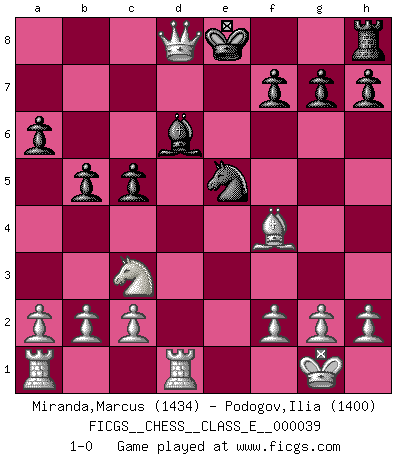 Last move : 1-0 2007 March 30 5:0:14 [Event "FICGS__CHESS__CLASS_E__000039"] [Site "FICGS"] [Date "2007.03.22"] [Round "1"] [White "Miranda,Marcus"] [Black "Podogov,Ilia"] [Result "1-0"] [WhiteElo "1434"] [BlackElo "1400"] 1.e4 e5 2.Nf3 Nc6 3.Bb5 d6 4.d4 exd4 5.Nxd4 Bd7 6.O-O Nxd4 7.Bxd7+ Qxd7 8.Qxd4 Nf6 9.Nc3 Be7 10.Rd1 c5 11.Qc4 a6 12.e5 Ng4 13.exd6 Bxd6 14.Bf4 b5 15.Qe4+ Ne5 16.Qxa8+ Qd8 17.Qxd8+ 1-0 Ruy Lopez : Old Steinitz defense Kingside Castling by player White (move 6) Player White won this chess game. Follow this game move after move (download)The King is a fighting piece. Use it ! (Wilhelm Steinitz) Schach ist die gewalttätigste aller Sportarten. (Garry Kasparov) Aún el Rey más flojo huye despavorido ante la amenaza de un Jaque doble. (Aaron Nimzowitsch) Le profane ne songe pas à la somme de jouissance dont il se prive, qui méconnaît ce jeu aux ressources aussi variées que passionnantes. (Jean-Marie Jeanton-Lamarche) A generalist learns less and less about more and more until he knows nothing about everything. (Author unknown)