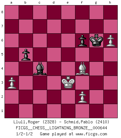 Last move : 1/2-1/2 2016 February 24 20:37:42 [Event "FICGS__CHESS__LIGHTNING_BRONZE__000644"] [Site "FICGS"] [Date "2016.02.24"] [Round "1"] [White "Llull,Roger"] [Black "Schmid,Pablo"] [Result "1/2-1/2"] [WhiteElo "2328"] [BlackElo "2410"] 1.e4 e5 2.Nf3 Nc6 3.Bb5 Nge7 4.O-O g6 5.c3 Bg7 6.d4 exd4 7.cxd4 d5 8.Bxc6+ Nxc6 9.exd5 Ne7 10.Nc3 O-O 11.Qb3 Nf5 12.Bf4 b6 13.Rfe1 Bb7 14.Rad1 a6 15.h3 Rc8 16.Ne5 Qh4 17.Bh2 Rce8 18.Qc4 Qd8 19.Nc6 Rxe1+ 20.Rxe1 Re8 21.Re4 Rxe4 22.Nxd8 Re1+ 23.Qf1 Rxf1+ 24.Kxf1 Ba8 25.Bxc7 Bxd4 26.d6 Be5 27.Na4 b5 28.Nc5 Nxd6 29.Nd7 f6 30.Nxe5 Ne8 31.Nxg6 hxg6 32.Ba5 Bd5 33.b3 Kg7 34.g3 Nd6 35.Ke2 Kf8 36.Kd3 Ke7 37.Kd4 Bg2 38.h4 Kd7 39.Ke3 Bh3 40.Kf3 Bf5 41.Bb4 Kxd8 42.Bxd6 Bb1 43.a3 a5 44.b4 axb4 45.Bxb4 Kd7 46.Kf4 Ke6 47.Bd2 Bf5 48.g4 Bc2 49.Bc3 Bb1 50.h5 gxh5 51.gxh5 Bc2 52.Bd2 Bd1 53.h6 Kf7 54.Ke4 Kg6 55.Bf4 Be2 56.Ke3 Bc4 1/2-1/2 Ruy Lopez : Cozio defense Kingside Castling by player White (move 4) Kingside Castling by player Black (move 10) 10 pieces endgame at move 50 : White KBPPP , Black KBPPP WHITE : King + 1 Bishop 3 Pawns BLACK : King + 1 Bishop 3 Pawns 9 pieces endgame at move 51 : White KBPPP , Black KBPP WHITE : King + 1 Bishop 3 Pawns BLACK : King + 1 Bishop 2 Pawns This chess game ended in a draw. Follow this game move after move (download)A thorough understanding of the typical mating continuations makes the most complicated sacrificial combinations leading up to them not only not difficult, but almost a matter of course. (Siegbert Tarrasch) Jeder weiß, dass Gasprom Putins persönliches Machtinstrument ist. Die Firma wird vom Kreml aus geleitet und wird schon deshalb nie transparent sein. (Garry Kasparov) Aquel que ve no otra dirección en el juego que la de dar Jaque Mate a su oponente, nunca será un buen jugador de Ajedrez. (Euwe) Votre seul travail dans les ouvertures est d'obtenir un milieu de partie jouable. (Lajos Portish) Unless in communicating with it one says exactly what one means, trouble is bound to result. (Alan Turing, about computers)