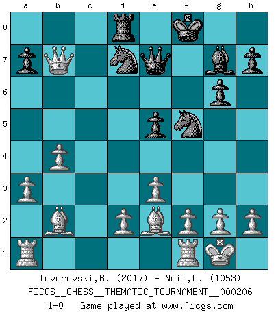 Last move : 1-0 2016 March 30 23:33:45 [Event "FICGS__CHESS__THEMATIC_TOURNAMENT__000206"] [Site "FICGS"] [Date "2016.02.25"] [Round "1"] [White "Teverovski,Bogoljub"] [Black "Neil,Charlie"] [Result "1-0"] [WhiteElo "2017"] [BlackElo "1053"] 1.b4 e5 2.a3 g6 3.Bb2 Bg7 4.Nf3 d6 5.e3 Be6 6.Be2 Nd7 7.O-O Ne7 8.Ng5 Bd5 9.c4 Be6 10.Nxe6 fxe6 11.Qb3 O-O 12.Nc3 c6 13.Ne4 d5 14.Ng5 Nf5 15.Nxe6 Qe7 16.cxd5 cxd5 17.Nxf8 Kxf8 18.Qxd5 Rd8 19.Qxb7 1-0 Polish (Sokolsky) opening Kingside Castling by player White (move 7) Kingside Castling by player Black (move 11) Player White won this chess game. Follow this game move after move (download)I give 98 percent of my mental energy to Chess. Others give only 2 percent. (Bobby Fischer) Gegen einen Schachcomputer zu verlieren ist wie Löcher in den Strümpfen zuhaben. Es ist nicht peinlich, solange man der einzige ist der es weiß. (Anonymous) Es muy difícil jugar en contra de la teoría de Einstein. - en su primera derrota en contra de Fischer (Mikhail Tal) Plusieurs personnes se sont demandées comment Tal faisait pour gagner... En fait, c'est très simple ! Il met ses pièces au centre de l'échiquier et les sacrifie quelque part ! (David Bronstein) Vladimir Ras-Putin is still alive... He is also a good actor, I saw him in the Lord of the Rings. (Rodolfo d'Ettorre)