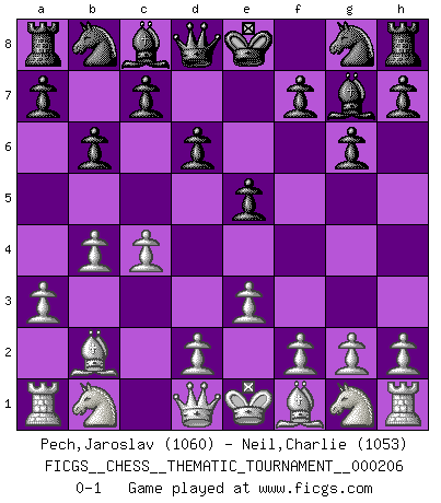 Last move : 0-1 2016 June 21 23:22:5 [Event "FICGS__CHESS__THEMATIC_TOURNAMENT__000206"] [Site "FICGS"] [Date "2016.02.25"] [Round "1"] [White "Pech,Jaroslav"] [Black "Neil,Charlie"] [Result "0-1"] [WhiteElo "1060"] [BlackElo "1053"] 1.b4 e5 2.a3 g6 3.Bb2 Bg7 4.e3 d6 5.c4 b6 0-1 This chess game has been lost on time (started : 2016.02.25 15:12:34) Polish (Sokolsky) opening Player Black won this chess game. Follow this game move after move (download)I look one move ahead... the best ! (Siegbert Tarrasch) Am wohlsten fühle ich mich, wenn ich sehe, wie sich mein Gegner im Todeskampf windet. (Robert James Fischer) Personalmente, yo prefiero mirar hacia el futuro en donde un programa de computadora gane el título mundial de Ajedrez. La humanidad necesita una lección de humildad. (Richard Dawkings) Avant la finale, les dieux ont créé le milieu de partie. (Tarrasch) A good book on your shelf is a friend that turns its back on you and remains a friend. (Author unknown)