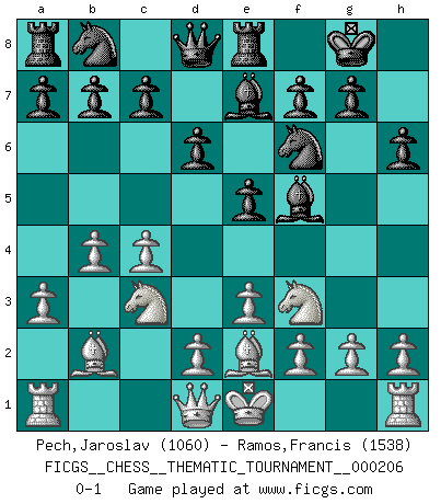 Last move : 0-1 2016 June 19 11:20:3 [Event "FICGS__CHESS__THEMATIC_TOURNAMENT__000206"] [Site "FICGS"] [Date "2016.02.25"] [Round "1"] [White "Pech,Jaroslav"] [Black "Ramos,Francis"] [Result "0-1"] [WhiteElo "1060"] [BlackElo "1538"] 1.b4 e5 2.a3 Nf6 3.Bb2 d6 4.e3 Be7 5.c4 O-O 6.Be2 Bf5 7.Nf3 h6 8.Nc3 Re8 0-1 This chess game has been lost on time (started : 2016.02.25 15:12:34) Polish (Sokolsky) opening Kingside Castling by player Black (move 5) Player Black won this chess game. Follow this game move after move (download)In a gambit you give up a Pawn for the sake of getting a lost game. (Samuel Standige Boden) Der Umstand, daß uns eine 7 Stunden Zeitkontrolle ermöglicht eine großartige, tiefe Partie zu spielen, ist für die Massenmedien nicht weiter von Bedeutung. (Alexej Shirov) Un mal día en el Ajedrez, es mejor que cualquier buen día en el trabajo. (Anonymous) Les échecs c'est le défi de l'alpiniste, toujours plus haut, prêt à tout pour monter à l'assaut du Roi ennemi. Les échecs, c'est de la musique en mouvement, un ballet majestueux pour les yeux. C'est de la poésie composée par les fantômes du passé qui au même titre que Rimbaud ou Verlaine méritent notre admiration. Les échecs, c'est de la peinture ou le moindre mouvement modifie le tableau pour en faire un Picasso ou un Van Gogh. Les échecs, c'est tout et rien, c'est la vie et la mort. Jjulie33 sur le forum de France-Echecs. They misunderestimated me. (George W. Bush, Bentonville nov. 6, 2000)