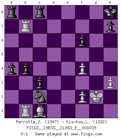 Last move : 0-1 2007 July 12 18:41:32 [Event "FICGS__CHESS__CLASS_E__000039"] [Site "FICGS"] [Date "2007.03.22"] [Round "1"] [White "Perrotta,John Zach"] [Black "Kis-Kos,Laszlo"] [Result "0-1"] [WhiteElo "1347"] [BlackElo "1332"] 1.e4 e5 2.Nf3 Nc6 3.Bb5 a6 4.Bxc6 dxc6 5.O-O f6 6.Nc3 Bg4 7.h3 Bh5 8.d3 Bb4 9.a3 Bxc3 10.bxc3 Ne7 11.d4 O-O 12.Qd3 exd4 13.cxd4 Bxf3 14.gxf3 Ng6 15.Qc4+ Kh8 16.a4 Qd7 17.Kh2 Qd6+ 18.Kg1 Nh4 19.f4 Nf3+ 20.Kg2 Qxd4 21.Qxd4 Nxd4 22.Rd1 Nxc2 23.Rb1 b5 24.axb5 cxb5 25.Rd7 c5 26.Rc7 Rfc8 27.Re7 c4 28.Bb2 c3 29.Bc1 b4 30.Rb7 a5 31.e5 a4 32.exf6 gxf6 0-1 Ruy Lopez : Exchange, Gligoric variation Kingside Castling by player White (move 5) Kingside Castling by player Black (move 11) Player Black won this chess game. Follow this game move after move (download)There are two types of sacrifices: correct ones and mine. (Mikhail Tal) Wenn Du einsam bist, wenn Du Dich in der Welt wie ein Fremder fühlst, spiele Schach. Das wird Deinen Geist erheben und Dein Ratgeber im Kampf sein. (Aristoteles) La enorme capacidad mental, en la que sin ella no puede un jugador de Ajedrez existir, es demasiado requerida por el Ajedrez al grado de que nunca podrá liberar su mente de este juego. (Albert Einstein) Je fais ceci parce que dans cinquante coups j'obtiendrai cela; je m'appelle Mikhail Moisevitch Botvinnik. (Botvinnik) I live to kill Traxler counterattack. (Ilmars Cirulis)