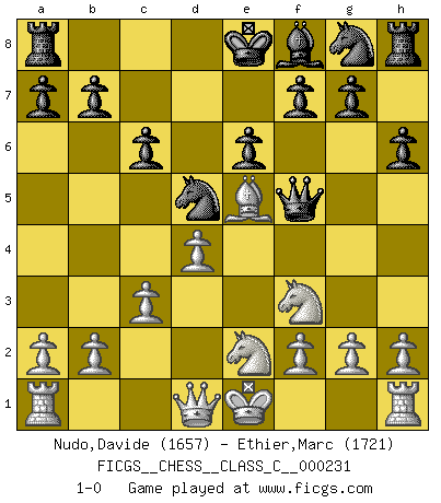 Last move : 1-0 2016 July 8 12:57:21 [Event "FICGS__CHESS__CLASS_C__000231"] [Site "FICGS"] [Date "2016.02.27"] [Round "1"] [White "Nudo,Davide"] [Black "Ethier,Marc"] [Result "1-0"] [WhiteElo "1657"] [BlackElo "1721"] 1.e4 c6 2.d4 d5 3.Nc3 dxe4 4.Nxe4 Nd7 5.Bd3 Ndf6 6.Ng5 h6 7.N5f3 Bf5 8.Bxf5 Qa5+ 9.c3 Qxf5 10.Ne2 e6 11.Bf4 Nd5 12.Be5 1-0 This chess game has been lost on time (started : 2016.02.27 7:45:40) Caro-Kann : Steinitz variation Player White won this chess game. Follow this game move after move (download)Place the contents of the Chess box in a hat, shake them up vigorously, pour them on the board from a height of two feet, and you get the style of Steinitz. (H. E. Bird) Der beste Spieler in einem Turnier gewinnt es nie. Er landet auf Platz zwei oder drei. (Siegbert Tarrasch) El Ajedrez tiene tanto misterio como las mujeres. (Purdy) J'ai toujours senti une vague pitié pour l'homme qui ne connaît rien aux échecs, tout comme j'en aurais pour un homme ignorant de l'amour. Les Echecs, comme la musique ou comme l'amour, ont le pouvoir de rendre heureux. (Siegbert Tarrasch) Memory is a crazy woman that hoards colored rags and throws away food. (Austin O'Malley)