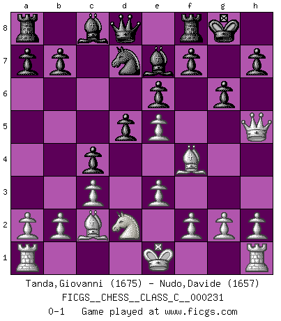 Last move : 0-1 2016 June 20 11:19:43 [Event "FICGS__CHESS__CLASS_C__000231"] [Site "FICGS"] [Date "2016.02.27"] [Round "1"] [White "Tanda,Giovanni"] [Black "Nudo,Davide"] [Result "0-1"] [WhiteElo "1675"] [BlackElo "1657"] 1.d4 d5 2.Bf4 Nf6 3.e3 e6 4.Nd2 c5 5.c3 Nbd7 6.Bd3 Be7 7.Ngf3 O-O 8.Ne5 c4 9.Bc2 Nxe5 10.dxe5 Nd7 11.Qh5 g6 0-1 Queen's pawn, Mason variation Kingside Castling by player Black (move 7) Player Black won this chess game. Follow this game move after move (download)It is always better to sacrifice your opponent's men. (Savielly Tartakower) Er war ein guter Schachspieler, aber ich kann Leute nicht ausstehen, die 'Heil Hitler' rufen (Über Alexander Aljechin). (Miguel Najdorf) Haz el enroque temprano y seguido. (Rob Sillars) Vous savez, camarade Pachman, je n'éprouve pas de plaisir à être ministre, je jouerais plutôt aux échecs comme vous, ou alors ferais une révolution au Venezuela. (Che Guevara à Ludek Pachman, 'Checkmate in Prague', 1975) You can think I'm wrong, but that's no reason to quit thinking. (Gregory House, House M.D.)