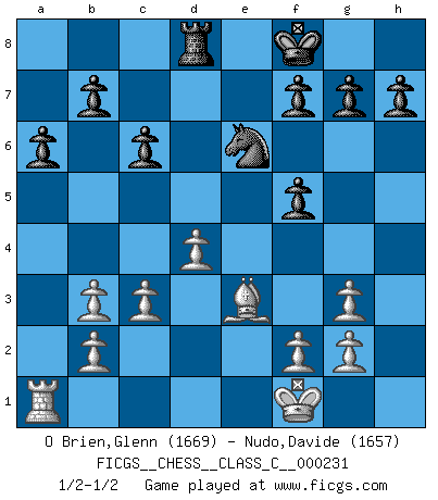 Last move : 1/2-1/2 2016 April 1 7:46:20 [Event "FICGS__CHESS__CLASS_C__000231"] [Site "FICGS"] [Date "2016.02.27"] [Round "1"] [White "O Brien,Glenn"] [Black "Nudo,Davide"] [Result "1/2-1/2"] [WhiteElo "1669"] [BlackElo "1657"] 1.e4 c6 2.d4 d5 3.Nc3 dxe4 4.Nxe4 Nf6 5.Nxf6+ exf6 6.c3 Bf5 7.Ne2 Bd6 8.Ng3 Qe7+ 9.Be3 Bxg3 10.hxg3 Nd7 11.Bd3 Qe6 12.O-O Bxd3 13.Qxd3 O-O 14.Rfe1 Rfe8 15.Bd2 Qg4 16.Bf4 Nf8 17.Re4 Qh5 18.Rae1 Rxe4 19.Qxe4 Ne6 20.Qc2 Qd5 21.Qb3 Qxb3 22.axb3 Rd8 23.Be3 f5 24.Ra1 a6 25.Kf1 Kf8 1/2-1/2 Caro-Kann : Tartakower (Nimzovich) variation Kingside Castling by player White (move 12) Kingside Castling by player Black (move 13) This chess game ended in a draw. Follow this game move after move (download)The battle for the ultimate truth will never be won. And that's why Chess is so fascinating. (Hans Kmoch) Um dein Spiel zu verbessern musst du zuallererst das Endspiel studieren, denn diese kann unabhängig studiert werden. Die Eröffnung und das Mittelspiel müssen immer in Bezug gesetzt werden zum Endspiel. (José Raúl Capablanca) La última cosa en que Fischer estaba interesado era en tonterías, siempre y cuando el Ajedrez estuviera involucrado. (Elie Agur) La victoire dans une partie d'Echecs appartient la plupart du temps à celui qui voit un peu plus loin que l'adversaire. (Lasker) Fear is the path to the dark side. Fear leads to anger; anger leads to hate; hate leads to suffering. I sense much fear in you. (Master Yoda in Star Wars ep.1)