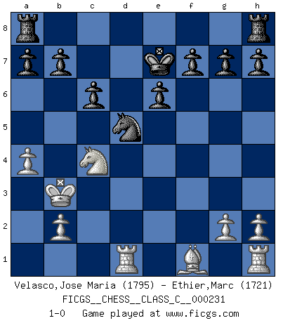 Last move : 1-0 2016 July 1 12:22:40 [Event "FICGS__CHESS__CLASS_C__000231"] [Site "FICGS"] [Date "2016.02.27"] [Round "1"] [White "Velasco,Jose Maria"] [Black "Ethier,Marc"] [Result "1-0"] [WhiteElo "1795"] [BlackElo "1721"] 1.d4 d5 2.c4 c6 3.Nf3 Nf6 4.Nc3 dxc4 5.a4 Bf5 6.Ne5 e6 7.f3 Bb4 8.e4 Bxe4 9.fxe4 Nxe4 10.Bd2 Qxd4 11.Nxe4 Qxe4+ 12.Qe2 Bxd2+ 13.Kxd2 Qd4+ 14.Kc2 Na6 15.Rd1 Qf4 16.Nxc4 Ke7 17.Qe5 Qxe5 18.Nxe5 Nb4+ 19.Kb3 Nd5 20.Nc4 1-0 This chess game has been lost on time (started : 2016.02.27 7:45:40) QGD Slav : Wiesbaden variation Player White won this chess game. Follow this game move after move (download)A passed Pawn increases in strength as the number of pieces on the board diminishes. (Capablanca) Kasparov ist eine Art Monster mit hundert Augen, denen auch nicht das Geringste entgeht. (Tony Miles) Una de estas pequeñas movidas modestas pudieran ser mas molestas a tu oponente que la amenaza mas grande. (Siegbert Tarrasch) L'action d'une oeuvre littéraire se déroule sur un champ de bataille. Les masques et les types du drame moderne correspondent aux pièces du jeu d'échecs. L'intrigue correspond aux coups et aux gambits, c'est à dire aux techniques du jeu telles qu'utilisées et interprétées par les joueurs. Les tactiques et les péripéties [mouvements] correspondent aux coups exécutés par l'adversaire. (Viktor Shklovsky) An expert is a man who has made all the mistakes which can be made in a very narrow field. (Niels Bohr)