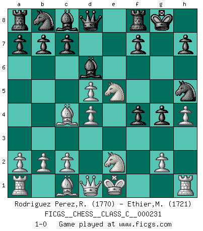 Last move : 1-0 2016 June 7 22:9:46 [Event "FICGS__CHESS__CLASS_C__000231"] [Site "FICGS"] [Date "2016.02.27"] [Round "1"] [White "Rodriguez Perez,Rene"] [Black "Ethier,Marc"] [Result "1-0"] [WhiteElo "1770"] [BlackElo "1721"] 1.e4 e5 2.f4 exf4 3.Nf3 g5 4.h4 g4 5.Ne5 Nf6 6.Bc4 d5 7.exd5 Bd6 8.d4 Nh5 9.Nc3 O-O 10.Ne2 1-0 This chess game has been lost on time (started : 2016.02.27 7:45:40) KGA : Kieseritsky, Berlin defense, 6.Bc4 Kingside Castling by player Black (move 9) Player White won this chess game. Follow this game move after move (download)Of all my Russian books, the defense contains and diffuses the greatest 'warmth' which may seem odd seeing how supremely abstract Chess is supposed to be. (Vladimir Nabokov) Die westlichen Werte sind eine Sprache, welche die Putin-Administration nicht versteht. (Garry Kasparov) El jugador táctico sabe que hacer cuando hay algo que hacer; mientras que el estratega sabe que hacer cuando no hay nada que hacer. (Gerald Abrahams) Mais n'est-ce pas déjà le limiter injurieusement que d'appeler les échecs un jeu? N'est-ce pas aussi une science, un art, ou quelque chose qui, comme le cercueil de Mahomet entre ciel et terre, est suspendu entre l'un et l'autre, et qui réunit un nombre incroyable de contraires ? (Stefan Zweig) When you don't know what to do, walk fast and look worried. (Anonymous)