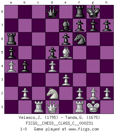 Last move : 1-0 2016 June 20 23:19:37 [Event "FICGS__CHESS__CLASS_C__000231"] [Site "FICGS"] [Date "2016.02.27"] [Round "1"] [White "Velasco,Jose Maria"] [Black "Tanda,Giovanni"] [Result "1-0"] [WhiteElo "1795"] [BlackElo "1675"] 1.d4 d5 2.c4 c6 3.Nf3 Nf6 4.Nc3 a6 5.Ne5 Nbd7 6.Bf4 e6 7.e3 Nxe5 8.Bxe5 Be7 9.Bd3 O-O 10.O-O b5 11.cxd5 cxd5 12.a4 b4 13.Nb1 a5 14.Nd2 Ba6 15.Bxa6 Rxa6 16.Rc1 1-0 QGD Slav : 4.Nc3 Kingside Castling by player Black (move 9) Kingside Castling by player White (move 10) Player White won this chess game. Follow this game move after move (download)Pawns: they are the soul of this game, they alone form the attack and defense. (Philidor) Immer nach dem besten Zug zu suchen ist ziemlich unpraktisch. (Nigel Short) Buenas posiciones no logran ganar juegos, buenas movidas sí. (Gerald Abrahams) Le profane ne songe pas à la somme de jouissance dont il se prive, qui méconnaît ce jeu aux ressources aussi variées que passionnantes. (Jean-Marie Jeanton-Lamarche) If you don't practice you don't deserve to win. (Andre Agassi)