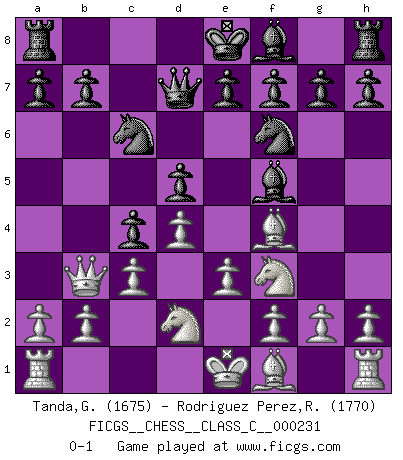Last move : 0-1 2016 June 10 22:26:1 [Event "FICGS__CHESS__CLASS_C__000231"] [Site "FICGS"] [Date "2016.02.27"] [Round "1"] [White "Tanda,Giovanni"] [Black "Rodriguez Perez,Rene"] [Result "0-1"] [WhiteElo "1675"] [BlackElo "1770"] 1.d4 d5 2.Bf4 c5 3.e3 Nf6 4.c3 Nc6 5.Nd2 Bf5 6.Qb3 Qd7 7.Ngf3 c4 0-1 This chess game has been lost on time (started : 2016.02.27 7:45:40) Queen's pawn, Mason variation, Steinitz counter-gambit Player Black won this chess game. Follow this game move after move (download)Becoming successful at Chess allows you to discover your own personality. That's what I want for the kids I teach. (Saudin Robovic) Rubinstein ist ein Turmendspiel, welches die Götter vor tausenden von Jahren begannen. (Savielly Grigorievitsch Tartakower) No soy una persona materialista y por eso, no resiento la falta o pérdida del dinero. La ausencia de cosas mundanas carece de importancia. Ya que el Ajedrez es una forma en la que puedo ser tan materialista como yo desee sin tener la necesidad de vender mi alma. (Jamie Walter Adams) Dans le domaine de la peinture, de la gravure et de la sculpture, dès la première décennie de notre siècle, les artistes abandonnent la représentation de la partie d'échecs pour se concentrer sur les pièces, sur les échiquiers et sur toutes les variations auxquelles les unes et les autres peuvent donner lieu. On passe en quelque sorte d'un thème social à un thème musical (au sens de la musica médiévale, c'est-à-dire d'une notion qui inclue le rythme, l'harmonie, la construction et la déconstruction, etc.). Graphiquement et picturalement, l'échiquier apparaît comme une structure ouverte, dynamique, d'une richesse infinie, autorisant toutes les combinatoires et débouchant sur des mouvements et des rythmes de nature exponentielle. (Michel Pastoureau) Establishing goals is all right if you don't let them deprive you of interesting detours. (Doug Larson)