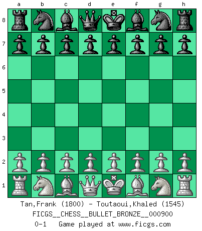 Last move : 0-1 2016 February 28 16:59:28 [Event "FICGS__CHESS__BULLET_BRONZE__000900"] [Site "FICGS"] [Date "2016.02.28"] [Round "1"] [White "Tan,Frank"] [Black "Toutaoui,Khaled"] [Result "0-1"] [WhiteElo "1800"] [BlackElo "1545"] 0-1 This chess game has been lost on time (started : 2016.02.28 11:48:36) Player Black won this chess game. Follow this game move after move (download)Good positions don't win games, good moves do. (Gerald Abrahams) Im Wettkampf zwischen starken Meistern kommen Fehler sehr selten vor, deshalb ist es mit bloßem Warten nicht getan. (José Raúl Capablanca) No volvere nunca a jugar contigo. Has insultado a mi amigo. - cuando un oponente se maldijo por una mala jugada (Miguel Najdorf) Toute estimation doit être constamment réévaluée. (Jacob Estrin) God is an atheist. (Unknown)