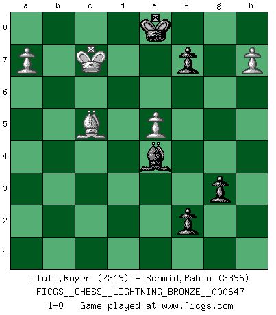 Last move : 1-0 2016 March 1 0:11:7 [Event "FICGS__CHESS__LIGHTNING_BRONZE__000647"] [Site "FICGS"] [Date "2016.02.29"] [Round "1"] [White "Llull,Roger"] [Black "Schmid,Pablo"] [Result "1-0"] [WhiteElo "2319"] [BlackElo "2396"] 1.e4 e6 2.d4 d5 3.Nc3 Nf6 4.Bg5 Bb4 5.e5 h6 6.Be3 Bxc3+ 7.bxc3 Ne4 8.Ne2 c5 9.f3 Ng5 10.dxc5 Nc6 11.Nd4 Qa5 12.Nxc6 bxc6 13.Qd4 Rb8 14.a4 Nh7 15.Bd2 O-O 16.c4 Qd8 17.cxd5 exd5 18.Bd3 Qe7 19.f4 Nf6 20.O-O Ne4 21.Bxe4 dxe4 22.Qxe4 Qxc5+ 23.Be3 Qc3 24.Bxa7 Rb2 25.Rf3 Qxc2 26.Qxc2 Rxc2 27.Rf2 Rxf2 28.Kxf2 Rd8 29.Rb1 Bf5 30.Rb8 Rxb8 31.Bxb8 Kf8 32.Bd6+ Ke8 33.Ke3 c5 34.Bxc5 h5 35.g3 Bc8 36.Ke4 g6 37.Kd5 Kd7 38.Bd6 Ba6 39.a5 Kc8 40.Kc6 Bb7+ 41.Kb6 Bf3 42.a6 Be4 43.a7 Bf3 44.h4 Be4 45.g4 hxg4 46.f5 Kd7 47.Bc5 Ke8 48.Kc7 g3 49.Kb8 gxf5 50.h5 f4 51.h6 f3 52.Kc7 f2 53.h7 1-0 French : MacCutcheon, Janowski variation Kingside Castling by player Black (move 15) Kingside Castling by player White (move 20) 10 pieces endgame at move 49 : White KBPPP , Black KBPPP WHITE : King + 1 Bishop 3 Pawns BLACK : King + 1 Bishop 3 Pawns Player White won this chess game. Follow this game move after move (download)Up to this point White has been following well-known analysis. But now he makes a fatal error: he begins to use his own head. (Siegbert Tarrasch) Wir irren allesamt, nur jeder irrt anders. (Georg Christoph Lichtenberg) Al jugar al Ajedrez entonces, podemos aprender: Primero: Previsión... Segundo: Prudencia... Tercero: Cautela... Y al final, aprendemos del Ajedrez el hábito de no ser desanimados por apariencias malas presentes en el estado de nuestros asuntos, el hábito de la esperanza por una oportunidad favorable y la perseveración de los secretos de los recursos. (Benjamin Franklin) Vous savez, camarade Pachman, je n'éprouve pas de plaisir à être ministre, je jouerais plutôt aux échecs comme vous, ou alors ferais une révolution au Venezuela. (Che Guevara à Ludek Pachman, 'Checkmate in Prague', 1975) To send light into the darkness of men's hearts - such is the duty of the artist. (Schumann)