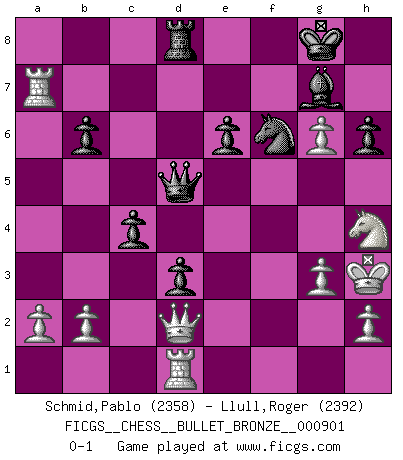 Last move : 0-1 2016 March 1 23:32:15 [Event "FICGS__CHESS__BULLET_BRONZE__000901"] [Site "FICGS"] [Date "2016.03.01"] [Round "1"] [White "Schmid,Pablo"] [Black "Llull,Roger"] [Result "0-1"] [WhiteElo "2358"] [BlackElo "2392"] 1.d4 Nf6 2.c4 e6 3.Nf3 b6 4.g3 Bb7 5.Bg2 c5 6.d5 exd5 7.cxd5 Bxd5 8.Nc3 Bc6 9.e4 d6 10.Nh4 g6 11.O-O Qd7 12.Nd5 Bg7 13.Bh6 O-O 14.Nxf6+ Bxf6 15.Bxf8 Kxf8 16.Qd2 Na6 17.Rad1 Rd8 18.Rfe1 Bg7 19.e5 Bxg2 20.Kxg2 d5 21.f4 d4 22.f5 Kg8 23.Kg1 Nc7 24.e6 fxe6 25.fxg6 h6 26.Rf1 d3 27.Kg2 Qd5+ 28.Kh3 c4 29.Rf7 Ne8 30.Rxa7 Nf6 0-1 Queen's Indian : 4.g3 Bb7 Kingside Castling by player White (move 11) Kingside Castling by player Black (move 13) Player Black won this chess game. Follow this game move after move (download)Chess is 99 percent tactics. (Teichmann) Das Schach ist nichts für kleine Geister, es beansprucht einen vollen Mann, der sich nicht sklavisch an das Überlieferte hält, sondern selbständig die Tiefen des Spiels zu ergründen sucht. (Wilhelm Steinitz) Cualquier cambio de material en una posición debe venir por medio de un mate, una captura o promoción de Peón. (Purdy) La vie est comme un jeu d'échecs : nous esquissons un plan, mais celui-ci est tributaire de ce que daignent faire l'adversaire aux échecs et le destin dans la vie. (Arthur Schopenhauer) A person who never made a mistake never tried anything new. (Albert Einstein)