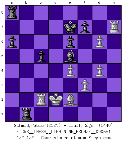 Last move : 1/2-1/2 2016 March 2 1:54:39 [Event "FICGS__CHESS__LIGHTNING_BRONZE__000651"] [Site "FICGS"] [Date "2016.03.02"] [Round "1"] [White "Schmid,Pablo"] [Black "Llull,Roger"] [Result "1/2-1/2"] [WhiteElo "2329"] [BlackElo "2440"] 1.d4 d5 2.c4 c6 3.Nf3 Nf6 4.Nc3 e6 5.Bg5 h6 6.Bh4 dxc4 7.e4 g5 8.Bg3 b5 9.h4 g4 10.Ne5 Bb7 11.Nxg4 Nxg4 12.Qxg4 Qxd4 13.Rd1 Qf6 14.a4 h5 15.Qg5 Qxg5 16.hxg5 a6 17.Be5 Rg8 18.Rxh5 Nd7 19.Bf4 b4 20.Nb1 c5 21.f3 Bc6 22.Nd2 c3 23.bxc3 bxc3 24.Nc4 Bxa4 25.Ra1 Bb5 26.Rh7 Ke7 27.g4 Bxc4 28.Bxc4 c2 29.Bg3 Bg7 30.Rc1 Bd4 31.Rxc2 Ne5 32.Be2 Rgb8 33.Bxe5 Rb1+ 34.Kd2 Bxe5 35.g6 Bf4+ 36.Kc3 Be5+ 37.Kd2 Bf4+ 38.Kc3 Be5+ 39.Kd2 1/2-1/2 QGD Slav : 4.Nc3 This chess game ended in a draw. Follow this game move after move (download)Live, lose, and learn, by observing your opponent how to win. (Amber Steenbock) Es hat in meinem Leben Zeiten gegeben, da ich sehr nahe daran war zu glauben, daß ich auch nicht eine einzige Schachpartie verlieren könnte. (José Raúl Capablanca) Yo adoro todas la posiciones. Denme una partida posicional difícil, y la jugaré. Pero posiciones totalmente ganadas, no las tolero. (Hein Donner) Vous n'êtes pas toujours obligé de jouer le meilleur coup. Un coup doit être actif, entreprenant, correct et beau ! (David Bronstein) Life is pain my dear and anyone who says otherwise is selling something. (Princess Bride)