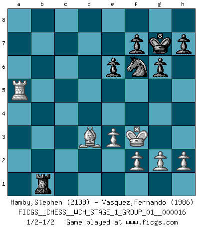 Last move : 1/2-1/2 2016 July 21 0:55:40 [Event "FICGS__CHESS__WCH_STAGE_1_GROUP_01__000016"] [Site "FICGS"] [Date "2016.03.02"] [Round "1"] [White "Hamby,Stephen"] [Black "Vasquez,Fernando"] [Result "1/2-1/2"] [WhiteElo "2138"] [BlackElo "1986"] 1.d4 Nf6 2.c4 e6 3.Nc3 d5 4.Nf3 Be7 5.Bf4 O-O 6.e3 Nbd7 7.Be2 dxc4 8.Bxc4 a6 9.a4 c5 10.O-O cxd4 11.Qxd4 b6 12.Rfd1 Bb7 13.Be2 Nc5 14.Nd2 Bc6 15.Qxd8 Rfxd8 16.Nc4 Rxd1+ 17.Rxd1 Bxa4 18.Ra1 b5 19.Nb6 Rd8 20.Nbxa4 bxa4 21.Nxa4 Rd2 22.Kf1 Nxa4 23.Rxa4 Rxb2 24.Bxa6 Rb1+ 25.Ke2 Nd5 26.Be5 Bf6 27.Bxf6 Nxf6 28.Ra5 g6 29.Kf3 Kg7 30.Bd3 1/2-1/2 Queen's pawn game Kingside Castling by player Black (move 5) Kingside Castling by player White (move 10) This chess game ended in a draw. Follow this game move after move (download)When you are lonely, when you feel yourself an alien in the world, play Chess. This will raise your spirits and be your counselor in war. (Aristotle) Schach ist Leben. (Robert James Fischer) Bobby solo arroja las piezas y solas caen en las casillas correctas. (Miguel Najdorf ) Mais n'est-ce pas déjà le limiter injurieusement que d'appeler les échecs un jeu? N'est-ce pas aussi une science, un art, ou quelque chose qui, comme le cercueil de Mahomet entre ciel et terre, est suspendu entre l'un et l'autre, et qui réunit un nombre incroyable de contraires ? (Stefan Zweig) If you have any trouble condescending, find a Unix user to show you how it's done. (Scott Adams)