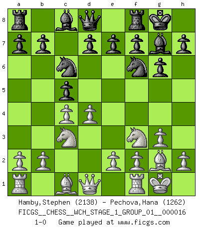 Last move : 1-0 2016 June 19 23:20:5 [Event "FICGS__CHESS__WCH_STAGE_1_GROUP_01__000016"] [Site "FICGS"] [Date "2016.03.02"] [Round "1"] [White "Hamby,Stephen"] [Black "Pechova,Hana"] [Result "1-0"] [WhiteElo "2138"] [BlackElo "1262"] 1.Nf3 Nf6 2.g3 g6 3.Bg2 Bg7 4.c4 O-O 5.O-O c5 6.Nc3 Nc6 7.d4 1-0 This chess game has been lost on time (started : 2016.03.02 2:8:17) Reti : King's Indian attack Kingside Castling by player Black (move 4) Kingside Castling by player White (move 5) Player White won this chess game. Follow this game move after move (download)If your opponent cannot do anything active, then don't rush the position; instead you should let him sit there, suffer, and beg you for a draw. (Jeremy Silman) Ich bin der einzige Schachspieler, der sich während der Vorbereitungen zum Turnier verletzt hat. (Woody Allen) Sin errores no puede haber brillantez. (Emanuel Lasker) La guerre est enfant de la passion, la passion est enfant du narcissisme et le narcissisme est l'enfant. (...) Une autre partie ? (Thibault de Vassal) Perception is reality. (Immanuel Kant)