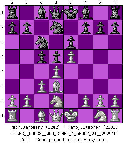 Last move : 0-1 2016 July 2 12:33:0 [Event "FICGS__CHESS__WCH_STAGE_1_GROUP_01__000016"] [Site "FICGS"] [Date "2016.03.02"] [Round "1"] [White "Pech,Jaroslav"] [Black "Hamby,Stephen"] [Result "0-1"] [WhiteElo "1242"] [BlackElo "2138"] 1.e4 e6 2.d4 d5 3.Nd2 Nf6 4.e5 Nfd7 5.Bd3 c5 6.c3 Nc6 0-1 This chess game has been lost on time (started : 2016.03.02 2:8:17) French : Tarrasch, Closed variation Player Black won this chess game. Follow this game move after move (download)Bobby is the most misunderstood, misquoted celebrity walking the face of this earth. (Yasser Seirawan) Zeige mir drei Eröffnungsvarianten und ich beweise dir, dass zwei davon inkorrekt sind. (Emanuel Lasker) Bobby es el jugador de Ajedrez mas fino que este país jamás haya producido. Su memoria para las movidas, su brillantez en soñar combinaciones y su feróz determinación por la victoria son algo extraño. (John Collins) La vie et les Echecs sont tous les deux une lutte constante. (Lasker) May the force be with you. (Han Solo in Star Wars ep.4)