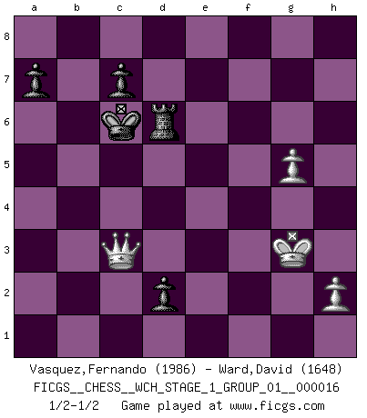 Last move : 1/2-1/2 2016 September 2 23:2:6 [Event "FICGS__CHESS__WCH_STAGE_1_GROUP_01__000016"] [Site "FICGS"] [Date "2016.03.02"] [Round "1"] [White "Vasquez,Fernando"] [Black "Ward,David"] [Result "1/2-1/2"] [WhiteElo "1986"] [BlackElo "1648"] 1.e4 e5 2.Nf3 Nc6 3.d4 exd4 4.Nxd4 Nf6 5.Nxc6 bxc6 6.e5 Qe7 7.Qe2 Nd5 8.c4 Ba6 9.Nd2 Nf4 10.Qe4 Ne6 11.Be2 g6 12.O-O Bg7 13.Nb3 O-O 14.Bd2 f6 15.exf6 Bxf6 16.Qc2 d5 17.Rae1 Nd4 18.Nxd4 Bxd4 19.Bd3 Qd6 20.Be3 c5 21.Bxd4 cxd4 22.b4 dxc4 23.Bxc4+ Bxc4 24.Qxc4+ Rf7 25.Re6 Qd7 26.Rd1 Rd8 27.g3 Kg7 28.Re4 d3 29.Qc3+ Kg8 30.Re3 Qf5 31.Rd2 Rfd7 32.Qb3+ Kg7 33.a4 h5 34.Qc3+ Kf8 35.Kg2 Kg8 36.b5 h4 37.gxh4 Qg4+ 38.Rg3 Qe4+ 39.f3 Qe1 40.h5 Rd6 41.Qb3+ Kg7 42.Qd1 Qe3 43.Qc1 R8d7 44.hxg6 Rxg6 45.Qc3+ Kh7 46.Rf2 Qf4 47.Rf1 Qxa4 48.Rxg6 Kxg6 49.Qc6+ Rd6 50.Qe8+ Kh6 51.Qh8+ Kg6 52.Re1 Qxb5 53.Kh1 Qc5 54.Re4 Qc1+ 55.Kg2 Qd2+ 56.Kg3 Qg5+ 57.Rg4 Qxg4+ 58.fxg4 d2 59.Qg8+ Kf6 60.g5+ Ke7 61.Qh7+ Kd8 62.Qh8+ Kd7 63.Qh7+ Kd8 64.Qh8+ Kd7 65.Qg7+ Kc6 66.Qc3+ 1/2-1/2 Scotch : Mieses variation Kingside Castling by player White (move 12) Kingside Castling by player Black (move 13) 10 pieces endgame at move 57 : White KQPP , Black KQRPPP WHITE : King + 1 Queen 2 Pawns BLACK : King + 1 Queen 1 Rook 3 Pawns 9 pieces endgame at move 58 : White KQPP , Black KRPPP WHITE : King + 1 Queen 2 Pawns BLACK : King + 1 Rook 3 Pawns This chess game ended in a draw. Follow this game move after move (download)I have always a slight feeling of pity for the man who has no knowledge of Chess. (Siegbert Tarrasch) Dass jemand wie Surab Asmaiparaschwili, der selbst Elopunkte gekauft hat , Vize-Präsident der Fide werden konnte, sagt schon einges über den Zustand dieser Organisation aus. (Joel Lautier) Una de estas pequeñas movidas modestas pudieran ser mas molestas a tu oponente que la amenaza mas grande. (Siegbert Tarrasch) Un footballeur joue avec ses pieds, parfois avec sa tête. Un joueur d'échecs ne joue qu'avec sa tête. Et quand il ne joue plus, il meurt. (Jacob Murray) There is no instance of a country having benefited from prolonged warfare. (Sun Tzu)