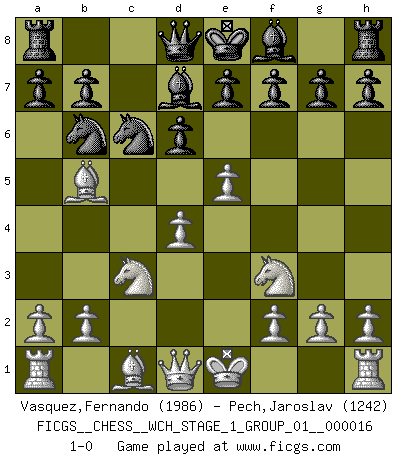Last move : 1-0 2016 June 24 23:29:25 [Event "FICGS__CHESS__WCH_STAGE_1_GROUP_01__000016"] [Site "FICGS"] [Date "2016.03.02"] [Round "1"] [White "Vasquez,Fernando"] [Black "Pech,Jaroslav"] [Result "1-0"] [WhiteElo "1986"] [BlackElo "1242"] 1.e4 c5 2.c3 Nf6 3.e5 Nd5 4.Nf3 Nc6 5.d4 cxd4 6.cxd4 d6 7.Bc4 Nb6 8.Bb5 Bd7 9.Nc3 1-0 This chess game has been lost on time (started : 2016.03.02 2:8:17) Sicilian : Alapin's variation (2.c3) Player White won this chess game. Follow this game move after move (download)Chess is in its essence a game, in its form an art, and in its execution a science. (Baron Tassilo) Ein Schachspiel besteht aus drei Phasen: Die erste, wenn du hofftst den Vorteil zu haben, die zweite, wenn du glaubst einen Vorteil zu haben, und die dritte.... wenn du weißt Du wirst verlieren. (Savielly Grigorievitsch Tartakower) El Ajedrez es como la guerra en un tablero. (Bobby Fischer) Les échecs sont plus proches de l'art de l'assassinat que de l'art de la guerre. (Arturo Perez-Reverte) A government big enough to give you everything you want is strong enough to take everything you have. (Thomas Jefferson)