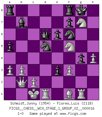 Last move : 1-0 2016 July 18 5:52:52 [Event "FICGS__CHESS__WCH_STAGE_1_GROUP_02__000016"] [Site "FICGS"] [Date "2016.03.02"] [Round "1"] [White "Schmidt,Jonny"] [Black "Flores,Luis"] [Result "1-0"] [WhiteElo "1954"] [BlackElo "2118"] 1.e4 c5 2.Nf3 d6 3.d4 cxd4 4.Nxd4 Nf6 5.Nc3 a6 6.Be3 e6 7.f3 b5 8.g4 b4 9.Nce2 h6 10.Qd2 Nbd7 11.O-O-O Qc7 12.h4 d5 13.Bh3 Nb6 14.b3 dxe4 15.Bf4 e3 16.Qxb4 Qb7 17.Bd6 a5 18.Qc5 Nbd7 19.Qa3 Bxd6 20.Qxd6 Ra6 21.Qa3 Nd5 22.Bf1 Ra8 23.Ng3 Qb4 24.Qb2 O-O 25.a3 Qd6 26.Rg1 Bb7 27.g5 hxg5 28.Nh5 N7f6 29.Nxg7 g4 30.Ndf5 1-0 Sicilian : Najdorf, Byrne (English) attack Queenside Castling by player White (move 11) Kingside Castling by player Black (move 24) Player White won this chess game. Follow this game move after move (download)I had a toothache during the first game. In the second game I had a headache. In the third game it was an attack of rheumatism. In the fourth game, I wasn't feeling well. And in the fifth game? Well, must one have to win every game ? (Siegbert Tarrasch) Der 70jährige Viktor Kortschnoi: Die Rentenanstalt wollte mich zwingen in Rente zu gehen. Meine Frau erhält jetzt eine Pension- und ich zahle weiter in die Rentenkasse ein! (Viktor Kortschnoi) La táctica fluye a partir de una posición superior. (Bobby Fischer) Les écrivains ont utilisé les échecs pour analyser les côtés extrêmes de la nature humaine. Dans ce cadre, les échecs offrent un champ d'expérimentation idéal. Mais on pourrait faire la même chose avec la peinture. Et là, en vous référant à Van Gogh, vous ne tirerez pas de conclusion définitive sur les peintres. (Gary Kasparov) Cactus - It is depressed cucumber. (Ilmars Cirulis)