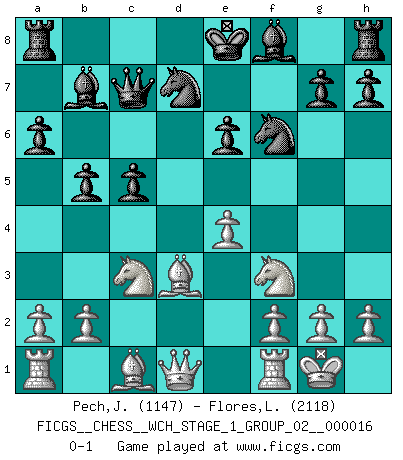 Last move : 0-1 2016 June 19 11:20:3 [Event "FICGS__CHESS__WCH_STAGE_1_GROUP_02__000016"] [Site "FICGS"] [Date "2016.03.02"] [Round "1"] [White "Pech,Jaroslav senior"] [Black "Flores,Luis"] [Result "0-1"] [WhiteElo "1147"] [BlackElo "2118"] 1.d4 d5 2.c4 c6 3.Nf3 Nf6 4.Nc3 e6 5.e3 Nbd7 6.Bd3 dxc4 7.Bxc4 b5 8.Bd3 Bb7 9.O-O a6 10.e4 c5 11.d5 Qc7 12.dxe6 fxe6 0-1 This chess game has been lost on time (started : 2016.03.02 2:9:41) QGD Slav : 4.Nc3 Kingside Castling by player White (move 9) Player Black won this chess game. Follow this game move after move (download)Via the squares on the chessboard, the Indians explain the movement of time and the age, the higher influences which control the world and the ties which link Chess with the human soul. (Al-Masudi) Ein Großmeister muß tausende Partien in seinem Kopf speichern, denn diese sind für Ihn, was die Worte der Muttersprache für gewöhnliche Leute sind, oder Noten für Musiker... (Garry Kasparov) La vida es como el Ajedrez, con lucha, competición y eventos buenos y malos. (Benjamin Franklin) Les Echecs représentent une sphère d'idées créatrices basée sur la volonté des deux protagonistes. (Smyslov) A specialist learns more and more about less and less until he knows everything about nothing. (Nicholas Murray Butler)