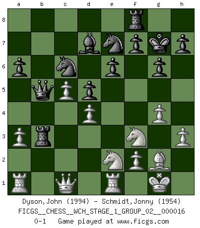 Last move : 0-1 2016 August 30 9:16:10 [Event "FICGS__CHESS__WCH_STAGE_1_GROUP_02__000016"] [Site "FICGS"] [Date "2016.03.02"] [Round "1"] [White "Dyson,John"] [Black "Schmidt,Jonny"] [Result "0-1"] [WhiteElo "1994"] [BlackElo "1954"] 1.Nf3 c5 2.c4 Nc6 3.g3 g6 4.Bg2 Bg7 5.Nc3 e6 6.e3 Nge7 7.O-O O-O 8.d4 d6 9.Rb1 cxd4 10.exd4 a6 11.Re1 d5 12.b3 Bd7 13.a3 Rc8 14.c5 b6 15.b4 bxc5 16.bxc5 Nf5 17.Ne2 Re8 18.Bg5 Qc7 19.Rc1 Qa5 20.g4 Nfe7 21.h3 Rb8 22.Bf4 Rb2 23.Ra1 Ra8 24.Qc1 Rb3 25.Bd2 Qb5 26.Bh6 Rf8 27.Bxg7 Kxg7 0-1 This chess game has been lost on time (started : 2016.03.02 2:9:41) Reti Opening Kingside Castling by player White (move 7) Kingside Castling by player Black (move 7) Player Black won this chess game. Follow this game move after move (download)It is always better to sacrifice your opponent's men. (Savielly Tartakower) Wenn Spassky eine Figur opfert kannst du genauso gut aufgeben. Aber wenn Tal eine Figur opfert, spiel weiter. Er könnte noch eine weitere opfern, und dann ... wer weiß? (Miguel Najdorf) Yo siempre he tenido un ligero sentimiento de lástima por una persona que no tiene conocimiento del Ajedrez. (Siegbert Tarrasch) Même un GMI sait rarement calculer sur plus de cinq coups une attaque à sacrifices. (Rudolf Spielmann) Luck never made a man wise. (Seneca, Letters to Lucilius)