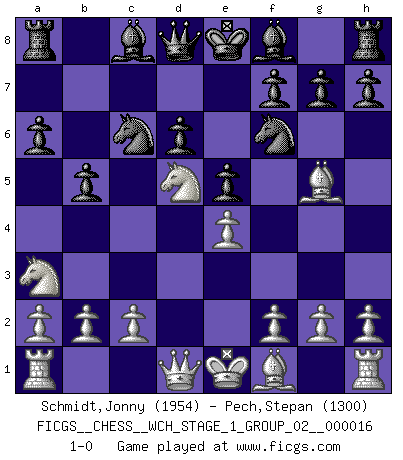 Last move : 1-0 2016 June 18 11:11:10 [Event "FICGS__CHESS__WCH_STAGE_1_GROUP_02__000016"] [Site "FICGS"] [Date "2016.03.02"] [Round "1"] [White "Schmidt,Jonny"] [Black "Pech,Stepan"] [Result "1-0"] [WhiteElo "1954"] [BlackElo "1300"] 1.e4 c5 2.Nf3 Nc6 3.Nc3 d6 4.d4 cxd4 5.Nxd4 e5 6.Ndb5 a6 7.Na3 b5 8.Nd5 Nf6 9.Bg5 1-0 This chess game has been lost on time (started : 2016.03.02 2:9:41) Sicilian defense Player White won this chess game. Follow this game move after move (download)Discovered check is the dive bomber of the Chessboard. (Reuben Fine) Aljechin war kein Nazi. Er war ein Opportunist. Ein schrecklicher Mann. Er liebte Geld über alles und würde für Geld ein Jude, ein Katolik oder ein Protestant werden. (Miguel Najdorf) El Ajedrez es 99 por ciento táctica. (Teichmann) Comme les marins qui ont mille raisons différentes d'aller en mer, les joueurs d'échecs en ont tout autant avant de s'installer devant une table et jouer... (Vincent Bertignac, philosophe) The only thing that matters is the evidence. (Horatio Caine, C.S.I. Miami)