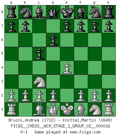 Last move : 0-1 2016 April 3 20:47:28 [Event "FICGS__CHESS__WCH_STAGE_1_GROUP_02__000016"] [Site "FICGS"] [Date "2016.03.02"] [Round "1"] [White "Bruini,Andrea"] [Black "Knittel,Martin"] [Result "0-1"] [WhiteElo "1712"] [BlackElo "1648"] 1.e4 c5 2.Nc3 d6 0-1 This chess game has been lost on time (started : 2016.03.02 2:9:41) Sicilian : Closed Player Black won this chess game. Follow this game move after move (download)The battle for the ultimate truth will never be won. And that's why Chess is so fascinating. (Hans Kmoch) Ich habe kein Problem mit Frauen, sondern nur mit dem Niveau ihres Schachspiels (Judith Polgar) En el tablero, la mentira e hipocresía no sobreviven mucho. (Emanuel Lasker) Fischer est le meilleur joueur du monde et Karpov n'est qu'un joueur de bistrot. (Garry Kasparov, agé de 16 ans) Beep ! (R2D2 in Star Wars ep.3)