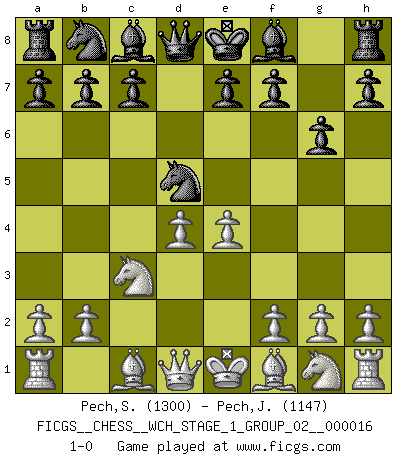 Last move : 1-0 2016 June 18 23:17:42 [Event "FICGS__CHESS__WCH_STAGE_1_GROUP_02__000016"] [Site "FICGS"] [Date "2016.03.02"] [Round "1"] [White "Pech,Stepan"] [Black "Pech,Jaroslav senior"] [Result "1-0"] [WhiteElo "1300"] [BlackElo "1147"] 1.d4 Nf6 2.c4 g6 3.Nc3 d5 4.cxd5 Nxd5 5.e4 1-0 This chess game has been lost on time (started : 2016.03.02 2:9:41) King's Indian defense, 3.Nc3 Player White won this chess game. Follow this game move after move (download)I won't play with you anymore. You have insulted my friend. - When an opponent cursed himself for a blunder. (Miguel Najdorf) Das Zentrum ist der Balkan des Schachbretts - Kriegshandlungen können in jedem Moment ausbrechen. (Aaron Nimzowitsch) Si el Ajedrez es una ciencia, es la mas inexacta. Si el Ajedrez es un arte, es demasiado inexacto para ser visto como tal. Si el Ajedrez es un deporte, es demasiado esotérico. Si el Ajedrez es un juego, es demasiado exigente para ser solo un juego. Si el Ajedrez es una aventura, es una muy demandante. Si el Ajedrez es una pasión, es una muy gratificante. Si el Ajedrez es la vida, es una muy triste. (Anónimo) Vous m'avez demandé de vous exposer quel est le fondement de la prière. Je ne fais que préparer les pièces du jeu sur la table... Nous sera-t-il permis d'en adopter les règles et si nous les appliquons scrupuleusement nous ne tarderons pas à faire mat le Roi divin ! Il ne pourra échapper à nos mains. (Sainte Thérèse d'Avila, Chemin de perfection) Follow your passion, and success will follow you. (Arthur Buddhold)