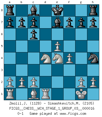 Last move : 0-1 2016 July 2 0:29:23 [Event "FICGS__CHESS__WCH_STAGE_1_GROUP_03__000016"] [Site "FICGS"] [Date "2016.03.02"] [Round "1"] [White "Zmolil,Josef"] [Black "Simashkevitch,Mykola"] [Result "0-1"] [WhiteElo "1128"] [BlackElo "2105"] 1.e4 e5 2.Nf3 Nc6 3.Bb5 Nf6 4.O-O Nxe4 5.d4 Nd6 6.Bxc6 dxc6 7.dxe5 Nf5 8.Qxd8+ Kxd8 9.Nc3 Ke8 10.Rd1 Ne7 11.Nd4 Ng6 12.Ne4 Be7 13.f4 Nh4 0-1 This chess game has been lost on time (started : 2016.03.02 2:9:43) Ruy Lopez : Berlin defense, Open variation Kingside Castling by player White (move 4) Player Black won this chess game. Follow this game move after move (download)Up to this point White has been following well-known analysis. But now he makes a fatal error: he begins to use his own head. (Siegbert Tarrasch) Ich würde mich als ganz normalen Jungen bezeichnen [Im Alter von 12]. (Sergej Karjakin) El Peón aislado arroja penumbra sobre todo el tablero. (Aaron Nimzovich) Les Cavaliers se révèlent fort utiles dans les positions fermées. D'habitude, les Fous sont un peu plus forts que les Cavaliers dans les positions ouvertes. Qu'on le veuille ou non, il restera toujours des exceptions ! Luck has a peculiar habit of favoring those who don't depend on it. (Author unknown)