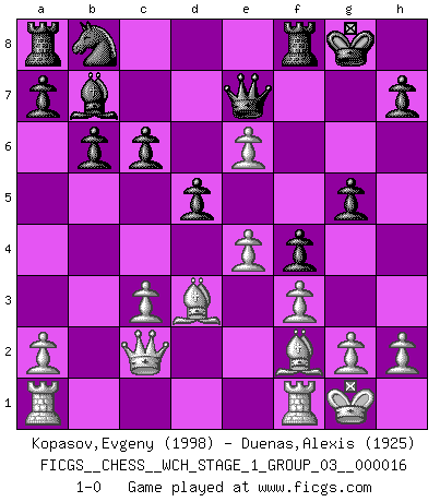 Last move : 1-0 2016 April 7 18:41:54 [Event "FICGS__CHESS__WCH_STAGE_1_GROUP_03__000016"] [Site "FICGS"] [Date "2016.03.02"] [Round "1"] [White "Kopasov,Evgeny"] [Black "Duenas,Alexis"] [Result "1-0"] [WhiteElo "1998"] [BlackElo "1925"] 1.d4 f5 2.Nf3 e6 3.Bf4 d5 4.e3 Nf6 5.c4 Bd6 6.Nc3 O-O 7.Bd3 c6 8.O-O Ne4 9.Qc2 b6 10.Ne5 Bb7 11.cxd5 exd5 12.f3 Nxc3 13.bxc3 g6 14.e4 g5 15.Bg3 f4 16.Bf2 Bxe5 17.dxe5 Qe7 18.e6 1-0 Dutch Kingside Castling by player Black (move 6) Kingside Castling by player White (move 8) Player White won this chess game. Follow this game move after move (download)When you play Bobby, it is not a question if you win or lose. It is a question if you survive. (Boris Spassky) Wenn Capablanka heute auf der Schachbühne erscheinen würde, hätte er ein halbes Jahr gebraucht um sich die Schachtheorie anzueignen. Und dann hätte er alles und jeden besiegt. (Mikhail Moiseyevich Botvinik) La vida es como un juego de Ajedrez, cambiando con cada movimiento. (Proverbio Chino) Un footballeur joue avec ses pieds, parfois avec sa tête. Un joueur d'échecs ne joue qu'avec sa tête. Et quand il ne joue plus, il meurt. (Jacob Murray) The best weapon against an enemy is another enemy. (Friedrich Nietzsche)