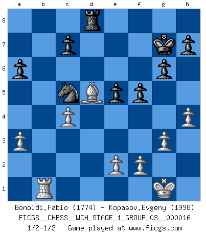 Last move : 1/2-1/2 2016 June 19 7:44:24 [Event "FICGS__CHESS__WCH_STAGE_1_GROUP_03__000016"] [Site "FICGS"] [Date "2016.03.02"] [Round "1"] [White "Bonoldi,Fabio"] [Black "Kopasov,Evgeny"] [Result "1/2-1/2"] [WhiteElo "1774"] [BlackElo "1998"] 1.c4 Nf6 2.g3 g6 3.Bg2 d5 4.cxd5 Nxd5 5.Nc3 Nb6 6.d3 Bg7 7.Be3 O-O 8.Qd2 Re8 9.Nf3 Nc6 10.O-O e5 11.Bg5 f6 12.Bh6 Be6 13.Bxg7 Kxg7 14.Ne4 Qe7 15.Rfc1 Bd5 16.Nc5 Nc4 17.dxc4 Bxf3 18.Bxf3 Qxc5 19.b4 Qxb4 20.Qxb4 Nxb4 21.Bxb7 Rab8 22.Bg2 Red8 23.a3 Na6 24.Rab1 Rxb1 25.Rxb1 Nc5 26.h4 a6 27.Bd5 f5 1/2-1/2 English, 1...Nf6 (Anglo-Indian defense) Kingside Castling by player Black (move 7) Kingside Castling by player White (move 10) This chess game ended in a draw. Follow this game move after move (download)Becoming successful at Chess allows you to discover your own personality. That's what I want for the kids I teach. (Saudin Robovic) Die größte Kunst beim Schach besteht darin dem Gegner nicht zu zeigen was er tun kann. (Garry Kasparov) La maestría del Ajedrez consiste esencialmente en analizar posiciónes de Ajedrez con precisión. (Mikhail Botvinnik) Même si l'adversaire joue le coup analysé précédemment, recommencez l'analyse en voyant la nouvelle position. Première règle de Blumenfeld Quotation,n.: The act of repeating erroneously the words of another. The words erroneously repeated. (Ambrose Bierce, The Devil's Dictionary)