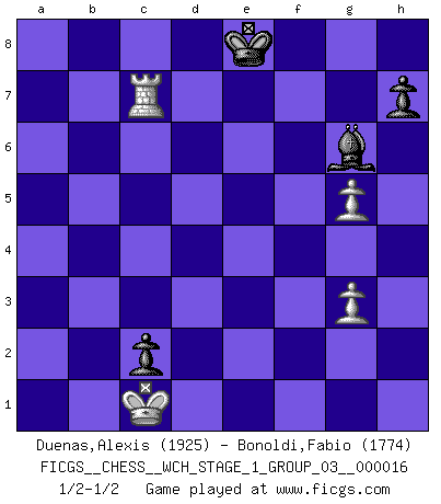 Last move : 1/2-1/2 2016 July 30 11:6:54 [Event "FICGS__CHESS__WCH_STAGE_1_GROUP_03__000016"] [Site "FICGS"] [Date "2016.03.02"] [Round "1"] [White "Duenas,Alexis"] [Black "Bonoldi,Fabio"] [Result "1/2-1/2"] [WhiteElo "1925"] [BlackElo "1774"] 1.d4 Nf6 2.c4 g6 3.Nc3 Bg7 4.e4 d6 5.Nf3 O-O 6.Be2 e5 7.O-O exd4 8.Nxd4 Re8 9.f3 Nc6 10.Be3 Nh5 11.Nxc6 bxc6 12.Qd2 f5 13.Rad1 Qe7 14.Rfe1 fxe4 15.Nxe4 Nf6 16.Bd3 Nxe4 17.Bxe4 Bd7 18.Re2 Qf7 19.Rc1 Be5 20.Qa5 Rab8 21.b3 d5 22.cxd5 Rb5 23.Qd2 cxd5 24.a4 dxe4 25.axb5 Bxb5 26.Rf2 Qxb3 27.Bxa7 exf3 28.Rxf3 Qe6 29.Kh1 Bd6 30.Bf2 Bd7 31.Re3 Qf5 32.Rxe8+ Bxe8 33.Bg3 Bxg3 34.hxg3 c5 35.Qe3 Bc6 36.Kh2 Qd5 37.Qf2 c4 38.Rf1 Qf5 39.Qxf5 gxf5 40.Rxf5 Be4 41.Rc5 Bd3 42.Rc7 Kf8 43.Kg1 Ke8 44.Kf2 Kd8 45.Ra7 Bg6 46.g4 c3 47.Ke3 Ke8 48.g5 c2 49.Kd2 Kf8 50.g3 Ke8 51.Rc7 Be4 52.Kc1 Bg6 1/2-1/2 King's Indian : Orthodox variation Kingside Castling by player Black (move 5) Kingside Castling by player White (move 7) 10 pieces endgame at move 39 : White KQRPP , Black KBPPP WHITE : King + 1 Queen 1 Rook 2 Pawns BLACK : King + 1 Bishop 3 Pawns 9 pieces endgame at move 39 : White KRPP , Black KBPPP WHITE : King + 1 Rook 2 Pawns BLACK : King + 1 Bishop 3 Pawns 8 pieces endgame at move 40 : White KRPP , Black KBPP WHITE : King + 1 Rook 2 Pawns BLACK : King + 1 Bishop 2 Pawns This chess game ended in a draw. Follow this game move after move (download)Life is a kind of Chess, with struggle, competition, good and ill events. (Benjamin Franklin) Strategie ist, wie man ein Mädchen auf den Rücksitz bekommt. Taktik ist, was man tut, wenn man dann dort ist. (Anonymous) Todos los Maestros de Ajedrez fueron un día unos principiantes. (Chernev) Je ne suis pas le dernier à jouer lâchement des coups douteux pendant le zeïtnot de l'adversaire pour l'achever: en effet les coups qui font le plus peur sont ceux que l'on ne comprend pas. Je me fais souvent peur quand je joue. (Un professeur anonyme) It is not enough to be a good player... you must also play well. (Siegbert Tarrasch)