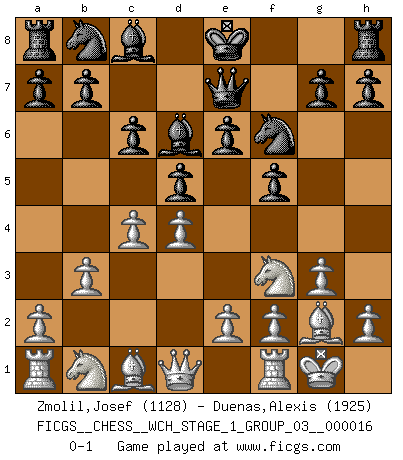 Last move : 0-1 2016 June 22 11:22:4 [Event "FICGS__CHESS__WCH_STAGE_1_GROUP_03__000016"] [Site "FICGS"] [Date "2016.03.02"] [Round "1"] [White "Zmolil,Josef"] [Black "Duenas,Alexis"] [Result "0-1"] [WhiteElo "1128"] [BlackElo "1925"] 1.d4 f5 2.g3 e6 3.Nf3 d5 4.Bg2 Bd6 5.O-O Nf6 6.c4 c6 7.b3 Qe7 0-1 This chess game has been lost on time (started : 2016.03.02 2:9:43) Dutch defense Kingside Castling by player White (move 5) Player Black won this chess game. Follow this game move after move (download)You are for me the Queen on d8 and I am the Pawn on d7 !! (Eduard Gufeld) Ein Großmeister muß tausende Partien in seinem Kopf speichern, denn diese sind für Ihn, was die Worte der Muttersprache für gewöhnliche Leute sind, oder Noten für Musiker... (Garry Kasparov) El Ajedrez es un expediente tonto que hace creer a la gente inactiva que hacen una cosa muy astuta cuando solamente estan perdiendo su tiempo. (George Bernard Shaw) Shah mat. Le roi est mort. Cri de fierté d'un joueur venant de terrasser son adversaire, courtoisement, sans effusion de sang. May the force be with you. (Han Solo in Star Wars ep.4)