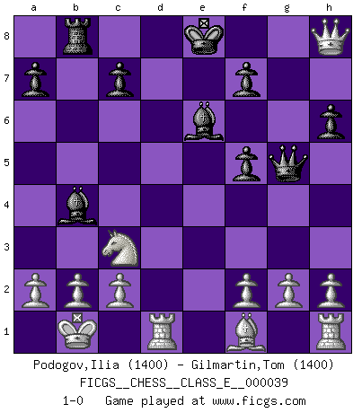 Last move : 1-0 2007 April 12 3:49:27 [Event "FICGS__CHESS__CLASS_E__000039"] [Site "FICGS"] [Date "2007.03.22"] [Round "1"] [White "Podogov,Ilia"] [Black "Gilmartin,Tom"] [Result "1-0"] [WhiteElo "1400"] [BlackElo "1400"] 1.e4 e5 2.Nf3 Nc6 3.Nc3 Nf6 4.d4 Bb4 5.Bg5 exd4 6.Nxd4 h6 7.Bxf6 gxf6 8.Nxc6 bxc6 9.Qf3 d5 10.O-O-O f5 11.exd5 Qg5+ 12.Kb1 cxd5 13.Qxd5 Rb8 14.Qe5+ Be6 15.Qxh8+ 1-0 Four knights : Scotch variation Queenside Castling by player White (move 10) Player White won this chess game. Follow this game move after move (download)Mistrust is the most necessary characteristic of the Chess player. (Siegbert Tarrasch) Die Arbeit ist etwas Unnatürliches. Die Faulheit allein ist göttlich. (Anatole France) El Ajedrez es en su esencia, un juego. En su forma, un arte. Y en su ejecución, una ciencia. (Baron Tassilo) Tout change constamment, y compris dans le monde des Echecs. (Botvinnik) The general who wins the battle makes many calculations in his temple before the battle is fought. The general who loses makes but few calculations beforehand. (Sun Tzu)