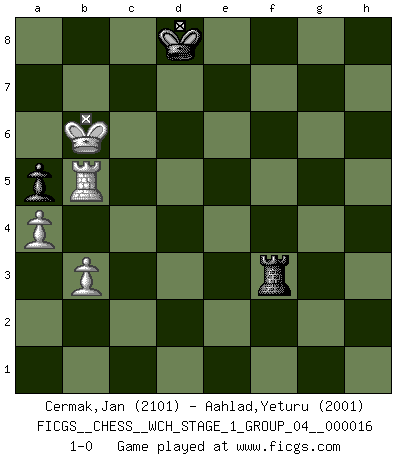 Last move : 1-0 2016 October 30 16:21:24 [Event "FICGS__CHESS__WCH_STAGE_1_GROUP_04__000016"] [Site "FICGS"] [Date "2016.03.02"] [Round "1"] [White "Cermak,Jan"] [Black "Aahlad,Yeturu"] [Result "1-0"] [WhiteElo "2101"] [BlackElo "2001"] 1.d4 Nf6 2.c4 e6 3.g3 d5 4.Nf3 Bb4+ 5.Bd2 Be7 6.Qc2 O-O 7.Bg2 Nbd7 8.O-O c6 9.b3 b6 10.Rd1 Ba6 11.a4 Qc8 12.Na3 Bb7 13.Qb2 Ne4 14.Be3 a5 15.Rac1 Qe8 16.Nc2 f6 17.Nce1 Bd6 18.Nd2 Nxd2 19.Qxd2 Kh8 20.Nd3 e5 21.cxd5 cxd5 22.dxe5 fxe5 23.f4 e4 24.Ne1 Nc5 25.Rb1 Qh5 26.Nc2 Rf6 27.h3 Qf7 28.Kh2 Kg8 29.Rf1 Rg6 30.Nd4 Na6 31.h4 Rf6 32.Bh3 Rf8 33.f5 Nc5 34.Bf4 Qe7 35.Bxd6 Qxd6 36.Qf4 h5 37.Qxd6 Rxd6 38.Rf4 Rdf6 39.g4 hxg4 40.Rxg4 Bc8 41.Rbg1 R8f7 42.Rg6 Bd7 43.Kg3 Kh7 44.Rg5 Re7 45.e3 Ref7 46.Bg4 Kh8 47.Rc1 Rf8 48.Rg1 R8f7 49.Rd1 Kg8 50.Rd2 Kh7 51.Bh5 Rf8 52.Bg6+ Kg8 53.h5 Nd3 54.Rh2 Ne5 55.h6 Nxg6 56.fxg6 gxh6 57.Rxh6 Be8 58.Kh4 Rf1 59.Rgh5 Rh1+ 60.Kg3 Rxh5 61.Rxh5 Rf6 62.Rxd5 Kg7 63.Re5 Bxg6 64.Kh4 Kh6 65.Kg4 Rd6 66.Nf5+ Bxf5+ 67.Kxf5 Kg7 68.Re6 Rd3 69.Rxb6 Rxe3 70.Kf4 Rh3 71.Kxe4 Kf7 72.Kd5 Rc3 73.Rb5 Ke7 74.Kd4 Rf3 75.Kc5 Kd8 76.Kb6 1-0 Catalan Opening Kingside Castling by player Black (move 6) Kingside Castling by player White (move 8) 10 pieces endgame at move 67 : White KRPPP , Black KRPPP WHITE : King + 1 Rook 3 Pawns BLACK : King + 1 Rook 3 Pawns 9 pieces endgame at move 69 : White KRPPP , Black KRPP WHITE : King + 1 Rook 3 Pawns BLACK : King + 1 Rook 2 Pawns 8 pieces endgame at move 69 : White KRPP , Black KRPP WHITE : King + 1 Rook 2 Pawns BLACK : King + 1 Rook 2 Pawns 7 pieces endgame at move 71 : White KRPP , Black KRP WHITE : King + 1 Rook 2 Pawns BLACK : King + 1 Rook 1 Pawn Player White won this chess game. Follow this game move after move (download)When I have White, I win because I am white; When I have Black, I win because I am Bogolyubov. (Bogolyubov) Die Fehler sind da, Sie warten nur darauf gemacht zu werden. (Savielly Grigorievitsch Tartakower) No puedes jugar al Ajedrez si eres de corazón noble. (Proverbio Francés) Un journaliste : 'Vous préférez avoir une dame de plus sur l'échiquier ou au lit ?' Boris Spassky : 'Ca dépend de la position.' The modern world has divided itself into Conservatives and Progressives. The business of Progressives is to go on making mistakes. The business of the Conservatives is to prevent the mistakes from being corrected. (G.K. Chesterton)