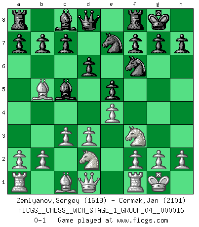 Last move : 0-1 2016 April 8 21:6:58 [Event "FICGS__CHESS__WCH_STAGE_1_GROUP_04__000016"] [Site "FICGS"] [Date "2016.03.02"] [Round "1"] [White "Zemlyanov,Sergey"] [Black "Cermak,Jan"] [Result "0-1"] [WhiteElo "1618"] [BlackElo "2101"] 1.e4 e5 2.Nf3 Nc6 3.Bb5 Nf6 4.d3 Bc5 5.c3 O-O 6.O-O d6 7.Nbd2 Ne7 0-1 This chess game has been lost on time (started : 2016.03.02 2:9:45) Ruy Lopez : Berlin defense Kingside Castling by player Black (move 5) Kingside Castling by player White (move 6) Player Black won this chess game. Follow this game move after move (download)You need not play well - just help your opponent to play badly. (Genrikh Chepukaitis) Offensichtlich kennt Kasparow nichts anderes als Schach, und ich könnte 500 weitere Spieler dieser Sorte benennen. (Judith Polgar) Un Peón pasado es un criminal, quién debe ser mantenido bajo candado y llave. Leves medidas, tales como vigilancia policiaca, no son suficientes. (Aaron Nimzovich) Ce qui caractérise les parties de combat, c'est que si le défenseur a constamment de difficiles problèmes à résoudre, l'attaquant doit chercher sans relâche de nouvelles possibilités d'attaque. (Koblentz) The various flowers seem good to different people. (Chinese proverb)
