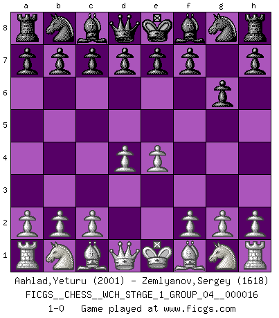 Last move : 1-0 2016 April 7 8:50:16 [Event "FICGS__CHESS__WCH_STAGE_1_GROUP_04__000016"] [Site "FICGS"] [Date "2016.03.02"] [Round "1"] [White "Aahlad,Yeturu"] [Black "Zemlyanov,Sergey"] [Result "1-0"] [WhiteElo "2001"] [BlackElo "1618"] 1.e4 g6 2.d4 1-0 This chess game has been lost on time (started : 2016.03.02 2:9:45) Robatsch (Modern) defense Player White won this chess game. Follow this game move after move (download)Chess is like life. (Boris Spassky) Wie, soll nun auch die Opposition abgeschafft werden? Ja, es tut mir leid, Ihnen diesen Schmerz nicht ersparen zu können. (Aaron Nimzowitsch) No hay precio que sea tan grande por la cabellera del Rey enemigo. (Koblentz) La menace est plus forte que l'exécution. (Aaron Nimzovitch) If only faces could talk... (Pat Summerall, Sportscaster during the Super Bowl)