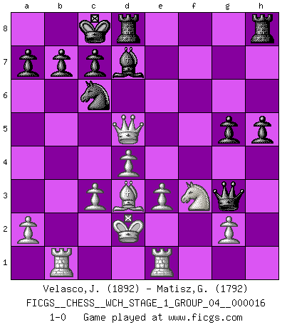 Last move : 1-0 2016 June 8 10:15:25 [Event "FICGS__CHESS__WCH_STAGE_1_GROUP_04__000016"] [Site "FICGS"] [Date "2016.03.02"] [Round "1"] [White "Velasco,Jose Maria"] [Black "Matisz,Gergely"] [Result "1-0"] [WhiteElo "1892"] [BlackElo "1792"] 1.d4 Nc6 2.Nf3 d5 3.c4 e6 4.Nc3 Bb4 5.Bg5 Nge7 6.e3 f6 7.Bf4 g5 8.Bg3 Nf5 9.Qc2 Nce7 10.Qa4+ Nc6 11.cxd5 exd5 12.Bd3 Bxc3+ 13.bxc3 h5 14.Rb1 Qd7 15.h4 Nxg3 16.fxg3 Qd6 17.hxg5 Qxg3+ 18.Kd2 fxg5 19.Qb5 Bd7 20.Qxd5 O-O-O 21.Rhe1 1-0 This chess game has been lost on time (started : 2016.03.02 2:9:45) Queen's pawn : Lundin (Kevitz-Mikenas) defense Queenside Castling by player Black (move 20) Player White won this chess game. Follow this game move after move (download)A man that will take back a move at Chess will pick a pocket. (Richard Fenton) Als ich elf wurde, wurde ich einfach gut. (Robert James Fischer) El Ajedrez demanda una total concentración. (Bobby Fischer) Echiquier : carré parfait, comme la Jérusalem nouvelle décrite par l'auteur de l'Apocalypse, huit cases sur huit, exaltation du chiffre 4, symbole du cosmos aux quatre horizons... où le noir et le blanc, l'ombre et la lumière, le mal et le bien s'entremêlent et se conjuguent. (Robert Couffignal, Le Gambit du poète) You think that education is too expensive ? Try ignorance. (Derek Bok)