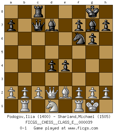 Last move : 0-1 2007 June 11 13:6:27 [Event "FICGS__CHESS__CLASS_E__000039"] [Site "FICGS"] [Date "2007.03.22"] [Round "1"] [White "Podogov,Ilia"] [Black "Sharland,Michael"] [Result "0-1"] [WhiteElo "1400"] [BlackElo "1505"] 1.e4 c5 2.Nc3 Nc6 3.Nf3 g6 4.d4 cxd4 5.Nxd4 Bg7 6.Nxc6 bxc6 7.Bd2 Rb8 8.Rb1 Nf6 9.Qc1 O-O 10.Bc4 d5 11.exd5 cxd5 12.Bd3 e5 13.O-O e4 14.Be2 d4 15.Bf4 Bd7 16.Bxb8 Qxb8 17.Nd1 Rc8 18.Qd2 Qc7 0-1 Sicilian : Closed, 2...Nc6 Kingside Castling by player Black (move 9) Kingside Castling by player White (move 13) Player Black won this chess game. Follow this game move after move (download)Different people feel differently about resigning. (Bobby Fischer) Nach Morphy wurde nichts neues mehr in der Behandlung offener Positionen gefunden. (Mikhail Moiseyevich Botvinik) Las combinaciones han sido siempre el aspecto más intrigante del Ajedrez. Los Maestros las buscan, el público las aplauden, los crÃticos las alaban. La razón se debe a que las combinaciones hacen posible que el Ajedrez sea más que un ejercicio matemático con una carencia de vida. Ellas son la poesÃa del juego, son del Ajedrez lo que la melodÃa es de la música. Ellas representan el triunfo de la mente sobre la materia. (Reuben Fine) Il s'avisa de me proposer d'apprendre les échecs qu'il jouait un peu... me voilà forcené des échecs. J'achète un échiquier, je m'enferme dans ma chambre, j'y passe des jours et des nuits à vouloir apprendre par cœur toutes les parties. (Jean-Jacques Rousseau, Confessions) Empty your mind, be formless, shapeless — like water. (Bruce Lee)