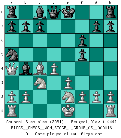 Last move : 1-0 2016 March 9 15:6:49 [Event "FICGS__CHESS__WCH_STAGE_1_GROUP_05__000016"] [Site "FICGS"] [Date "2016.03.02"] [Round "1"] [White "Gounant,Stanislas"] [Black "Peugeot,Alex"] [Result "1-0"] [WhiteElo "2081"] [BlackElo "1444"] 1.d4 f5 2.Bg5 Nf6 3.Bxf6 exf6 4.e3 d5 5.c4 dxc4 6.Bxc4 Nc6 7.Nc3 Bb4 8.Nge2 Na5 9.Qa4+ 1-0 Dutch, 2.Bg5 variation Player White won this chess game. Follow this game move after move (download)The Pawns are the soul of the game. (Francois Andre Danican Philidor) Am wohlsten fühle ich mich, wenn ich sehe, wie sich mein Gegner im Todeskampf windet. (Robert James Fischer) Los problemas de Ajedrez exigen del compositor las mismas virtudes que caracterizan todo el arte de valor: originalidad, invención, concisión, armonía, complejidad e insinceridad explendida. (Vladimir Nabokov) Il (Jacob Murray) ne joue pas pour le bon coup, mais pour le meilleur. (Eloi Relange) Locking firmely the window serves nothing, only small thiefs pass through there, the big thiefs enter through the front door. (Luc-Olivier Leclerc)