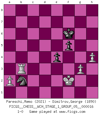Last move : 1-0 2016 August 26 17:32:59 [Event "FICGS__CHESS__WCH_STAGE_1_GROUP_05__000016"] [Site "FICGS"] [Date "2016.03.02"] [Round "1"] [White "Pareschi,Remo"] [Black "Dimitrov,George"] [Result "1-0"] [WhiteElo "2021"] [BlackElo "1890"] 1.d4 Nf6 2.c4 g6 3.Nc3 d5 4.f3 Bg7 5.e4 dxe4 6.fxe4 e5 7.d5 O-O 8.Nf3 Qe7 9.Bd3 Nbd7 10.O-O b6 11.Bg5 h6 12.Bd2 a5 13.Qc1 g5 14.Nxg5 hxg5 15.Bxg5 Re8 16.Kh1 Ba6 17.Be2 Qb4 18.Rf3 Nh7 19.Bh6 Bf8 20.Rg3+ Kh8 21.Rh3 Qd6 22.Qe3 Bxh6 23.Rxh6 f6 24.Qh3 Re7 25.Rf1 Rg8 26.b3 Reg7 27.Bg4 Ndf8 28.Bf5 a4 29.Rg1 a3 30.Nd1 Rf7 31.Ne3 Rg5 32.Qf3 R5g7 33.Rd1 Rg5 34.h4 R5g7 35.Bh3 Qd8 36.Be6 Bc8 37.Nf5 Bd7 38.Qh5 Be8 39.Bxf7 Bxf7 40.Qf3 Bg6 41.Nxg7 Kxg7 42.Rxg6 Nxg6 43.Qg4 Kh6 44.g3 Qe7 45.Kg2 Qd6 46.Rc1 Nhf8 47.Rb1 Qb4 48.Rf1 Nh7 49.Qe2 Kg7 50.Qe1 Qd6 51.b4 c6 52.Qc3 Qd7 53.Rf5 Ne7 54.Rf2 Nc8 55.Qf3 cxd5 56.exd5 Ne7 57.c5 bxc5 58.bxc5 Qxd5 59.Qxd5 Nxd5 60.Rd2 Ne7 61.Rd6 f5 62.c6 Nf6 63.c7 e4 64.Rd8 Kg6 65.c8Q Nxc8 66.Rxc8 Nd5 67.Rc6+ Kf7 68.Rc5 Ke6 69.Ra5 Ne3+ 70.Kf2 Nc4 71.Ra6+ Kf7 72.Ra4 Nb2 73.Rxa3 Kf6 74.Rb3 1-0 King's Indian defense, 3.Nc3 Kingside Castling by player Black (move 7) Kingside Castling by player White (move 10) Promotion Queen by player White (move 65) 10 pieces endgame at move 66 : White KRPPP , Black KNPPP WHITE : King + 1 Rook 3 Pawns BLACK : King + 1 Knight 3 Pawns 9 pieces endgame at move 73 : White KRPPP , Black KNPP WHITE : King + 1 Rook 3 Pawns BLACK : King + 1 Knight 2 Pawns Player White won this chess game. Follow this game move after move (download)If you aren't afraid of Spassky, then I have removed the element of money. (Jim Slater) Wenn ich gewinne bin ich ein Genie. Wenn nicht, dann bin ich keines. (Robert James Fischer) Por tratar de evitar la pérdida de una pieza, muchas personas han perdido una partida de Ajedrez. (Savielly Tartakover) On croit qu'il y a plus de mauvais joueurs que de bons joueurs, c'est faux : Il y a autant de joueurs qui gagnent que de joueurs qui perdent. (Philippe Geluck) Nothing is more important for teaching us to understand the concepts we have than constructing fictitious ones. (Ludwig Wittgenstein)
