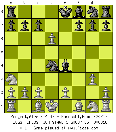 Last move : 0-1 2016 March 9 15:7:28 [Event "FICGS__CHESS__WCH_STAGE_1_GROUP_05__000016"] [Site "FICGS"] [Date "2016.03.02"] [Round "1"] [White "Peugeot,Alex"] [Black "Pareschi,Remo"] [Result "0-1"] [WhiteElo "1444"] [BlackElo "2021"] 1.f4 e5 2.fxe5 Nc6 3.d4 Qh4+ 4.g3 Qxd4 5.Qxd4 Nxd4 6.Kd1 d6 7.exd6 Bf5 8.Na3 Be4 0-1 Bird : From gambit Player Black won this chess game. Follow this game move after move (download)Daring ideas are like Chess men moved forward. They may be beaten, but they may start a winning game. (Johann Wolfgang von Goethe) Jede Eröffnung ist gut genug um gespielt zu werden, wenn nur ihr Ruf schlecht genug ist. (Savielly Grigorievitsch Tartakower) El Ajedrez es parte de la cultura, y si una cultura esta en decadencia, entonces también el Ajedrez declinará. (Mikhail Botvinnik) Plusieurs personnes se sont demandées comment Tal faisait pour gagner... En fait, c'est très simple ! Il met ses pièces au centre de l'échiquier et les sacrifie quelque part ! (David Bronstein) Every man's memory is his private literature. (Aldous Huxley)