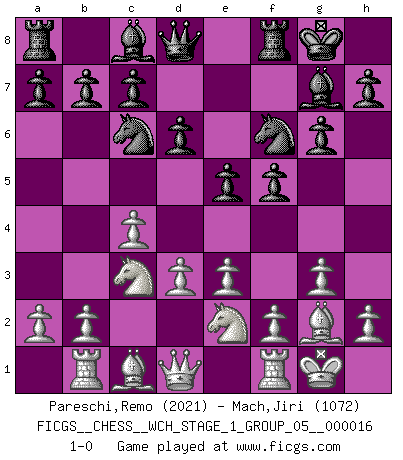 Last move : 1-0 2016 June 17 23:4:31 [Event "FICGS__CHESS__WCH_STAGE_1_GROUP_05__000016"] [Site "FICGS"] [Date "2016.03.02"] [Round "1"] [White "Pareschi,Remo"] [Black "Mach,Jiri"] [Result "1-0"] [WhiteElo "2021"] [BlackElo "1072"] 1.c4 e5 2.g3 Nc6 3.Bg2 f5 4.Nc3 Nf6 5.e3 g6 6.Nge2 Bg7 7.d3 d6 8.Rb1 O-O 9.O-O 1-0 This chess game has been lost on time (started : 2016.03.02 2:9:49) English Opening Kingside Castling by player Black (move 8) Kingside Castling by player White (move 9) Player White won this chess game. Follow this game move after move (download)The hardest game to win is a won game. (Emanuel Lasker) Ich organisiere ein großes Turnier, was mich etwa 120000 Dollar kostet. Ich denke, das ist das erste Mal in der Schachgeschichte, daß ein Schachgroßmeister auch als Mäzen auftritt. (Miguel Najdorf) Si tu oponente no puede hacer nada activo, entonces no apures la posición; En vez de eso, dejalo estar sentado ahí, sufriendo y rogandote por un empate. (Jeremy Silman) Les échecs sont un jeu terrible. Si vous n'avez pas le centre, votre adversaire a une position plus libre. Par contre, si vous avez le centre, alors vous avez vraiment quelque chose pour laquelle vous inquiéter ! (Siegbert Tarrasch) If we don't succeed, we run the risk of failure. (George W. Bush)