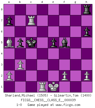 Last move : 1-0 2007 April 21 6:4:9 [Event "FICGS__CHESS__CLASS_E__000039"] [Site "FICGS"] [Date "2007.03.22"] [Round "1"] [White "Sharland,Michael"] [Black "Gilmartin,Tom"] [Result "1-0"] [WhiteElo "1505"] [BlackElo "1400"] 1.e4 e5 2.Bc4 Nf6 3.d4 Nc6 4.Nf3 h6 5.Nxe5 Nxe5 6.dxe5 Nxe4 7.Bxf7+ Kxf7 8.Qd5+ Ke8 9.Qxe4 Qe7 10.Nc3 d6 11.Nd5 Qxe5 12.Nxc7+ Kd7 13.Qxe5 dxe5 14.Nxa8 Bc5 15.Bd2 b5 16.Ba5 Bb7 17.Nc7 Bxg2 18.Rg1 Be4 19.Rxg7+ Kc6 20.Ne6 Bxc2 21.Rc1 Bf5 22.Nxc5 Kd5 23.Rd1+ Kc4 24.b3+ Kxc5 25.Rc7+ 1-0 Bishop's Opening : Ponziani gambit Player White won this chess game. Follow this game move after move (download)If one piece is badly posted, the whole game is bad. (Tarrasch) Frage: Wie viele Autos haben Sie schon zerstört? - Antwort: Nur zwei. (Loek van Wely) Ciertamente, de todas la drogas del mundo, el Ajedrez debe ser el mas placentero permamentemente. (Assiac) Les Echecs sont affaire de jugement sensible. Savoir quand frapper et quand esquiver. (Fischer) Warrior pose battles inner weakness and wins focus. You see that there is no war within you. You're on your own side, and you are your own strength. (Terri Guillemets)