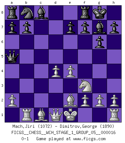 Last move : 0-1 2016 June 18 23:17:42 [Event "FICGS__CHESS__WCH_STAGE_1_GROUP_05__000016"] [Site "FICGS"] [Date "2016.03.02"] [Round "1"] [White "Mach,Jiri"] [Black "Dimitrov,George"] [Result "0-1"] [WhiteElo "1072"] [BlackElo "1890"] 1.d4 Nf6 2.c4 g6 3.Nc3 d5 4.cxd5 Nxd5 5.e4 Nxc3 6.bxc3 Bg7 7.Nf3 c5 8.Rb1 O-O 9.Be2 cxd4 10.cxd4 Qa5+ 0-1 This chess game has been lost on time (started : 2016.03.02 2:9:49) King's Indian defense, 3.Nc3 Kingside Castling by player Black (move 8) Player Black won this chess game. Follow this game move after move (download)A passed Pawn increases in strength as the number of pieces on the board diminishes. (Capablanca) Obendrein hat der FIDE-Präsident den Revolutionsführer Gaddafi zum »Großmeister« ernannt, am Ende der WM. Das ist lächerlich! (Joel Lautier) Botvinnik trató de alejar el misterio referente al Ajedrez, siempre relacionandolo a situaciones de la vida diaria. Solía llamar al Ajedrez un problema inexacto típico, similar a aquellos en que la gente tiene siempre que resolver a cada día. (Garry Kasparov) Une platitude souvent récitée à propos des Echecs est qu'une des choses les plus difficiles à réaliser est de gagner une position gagnante. Cela ne manque pas de sens mais, pour ma part, j'ai toujours trouvé plus difficile de gagner une position perdante. (Tim Krabbe) Luck never made a man wise. (Seneca, Letters to Lucilius)